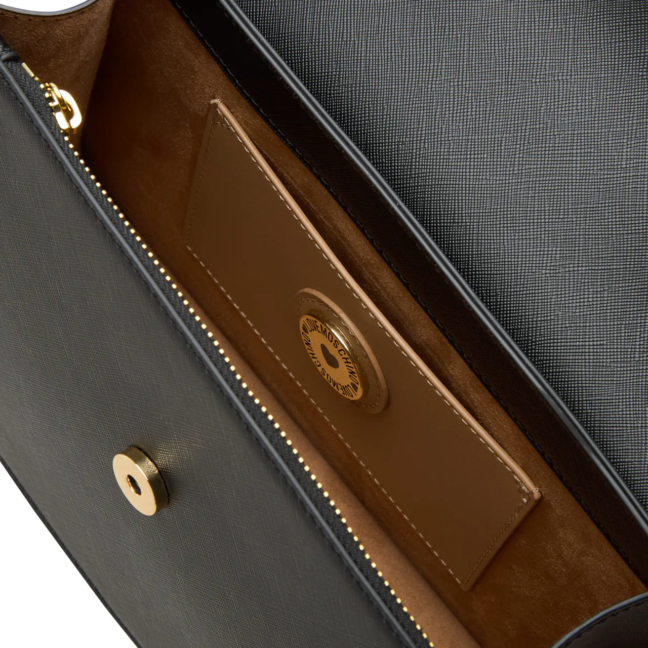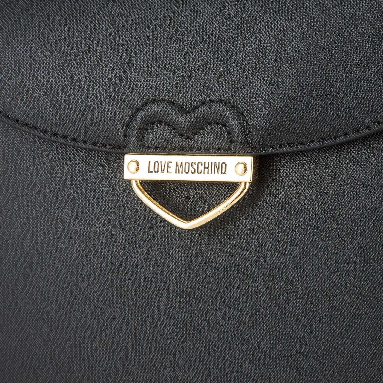 - Top carry handles, foldover flap closure, secure snap-button fastening, gold-tone hardware, detachable adjustable crossbody strap, heart logo hardware to the front, tonal stitching, crosshatch finish