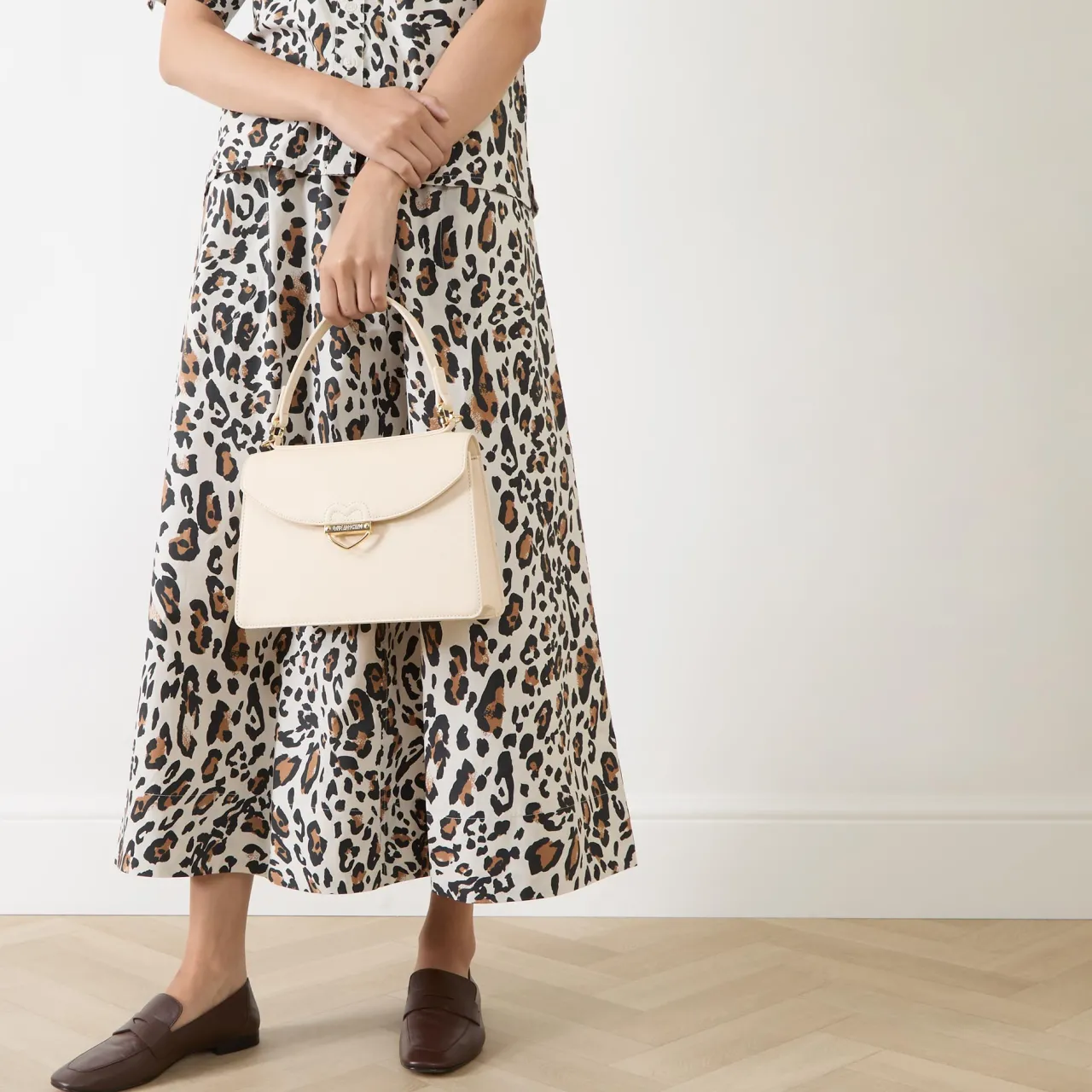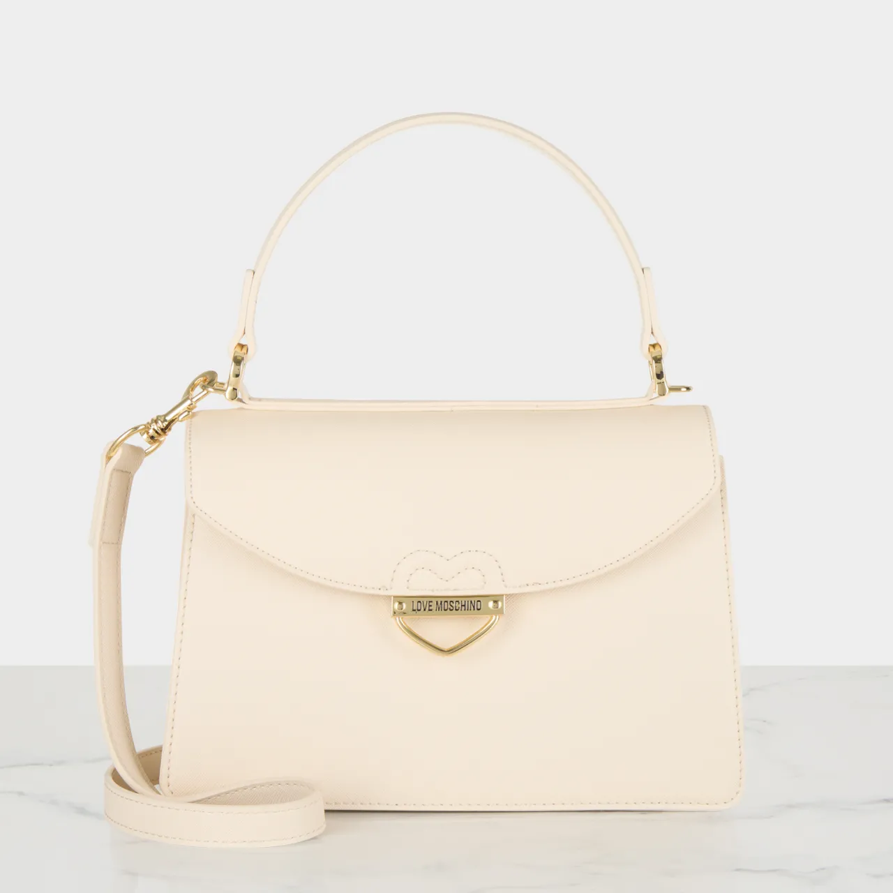 - Top carry handles, foldover flap closure, secure snap-button fastening, gold-tone hardware, detachable adjustable crossbody strap, heart logo hardware to the front, tonal stitching, crosshatch finish