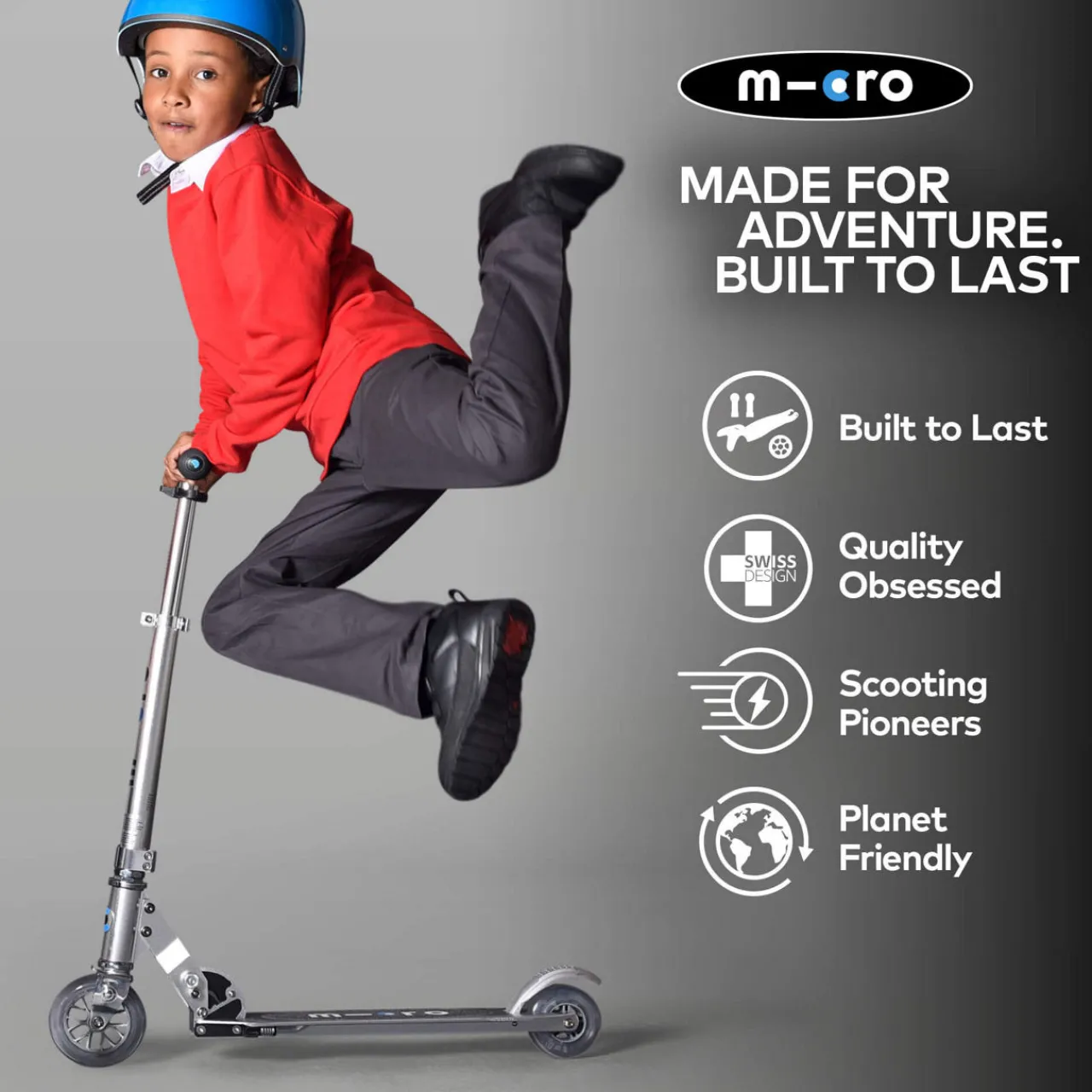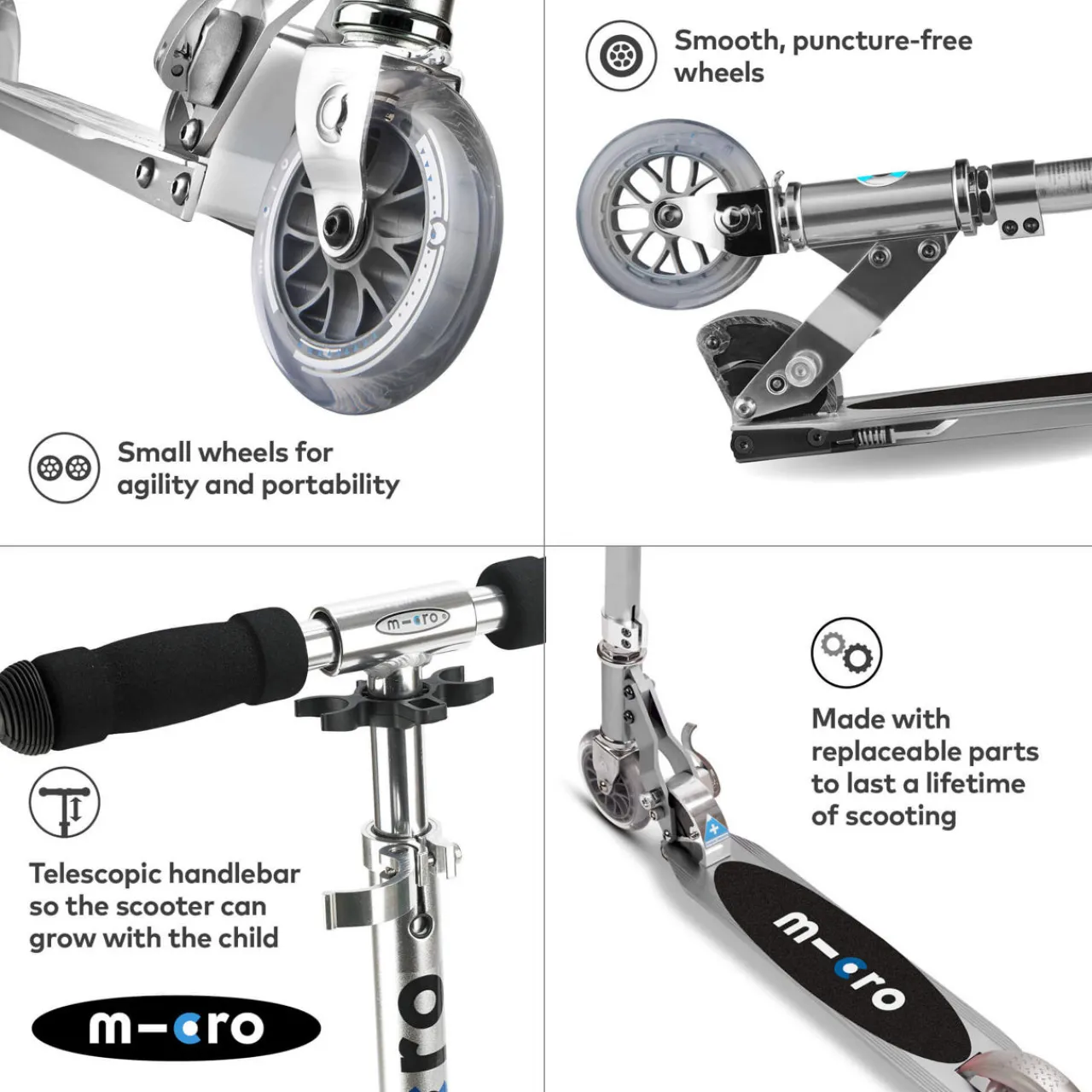 - Soft grip handlebars, adjustable, folds flat, two wheels, kickstand, stripe details, rear brake