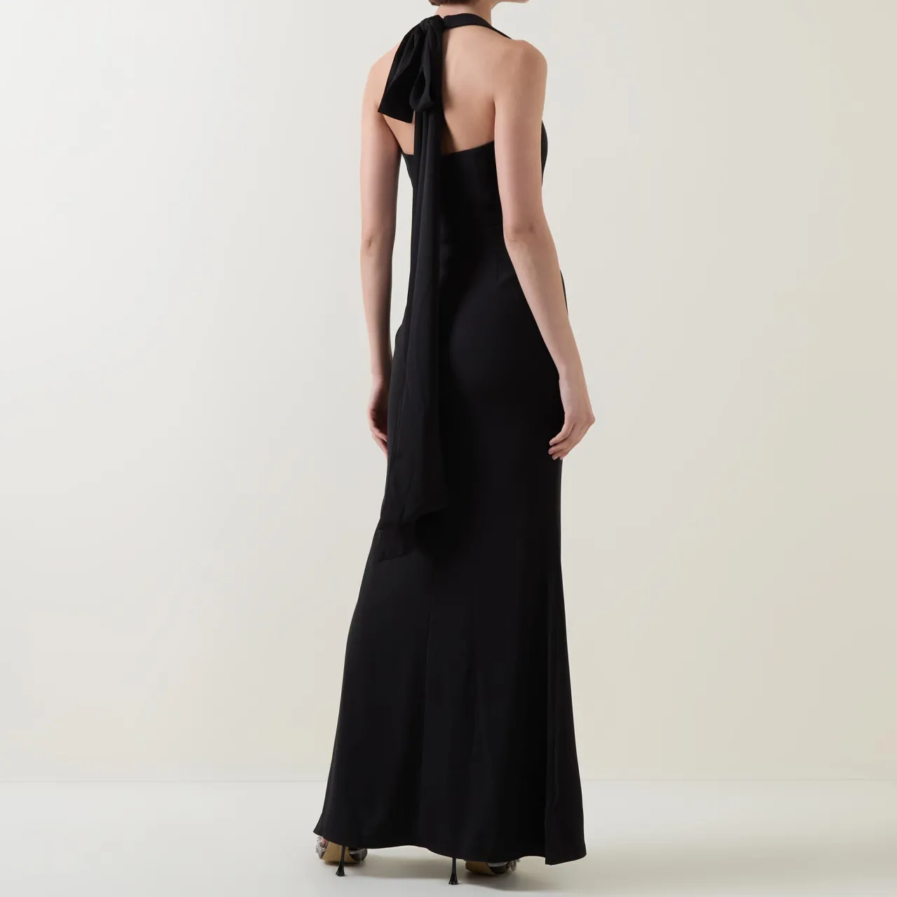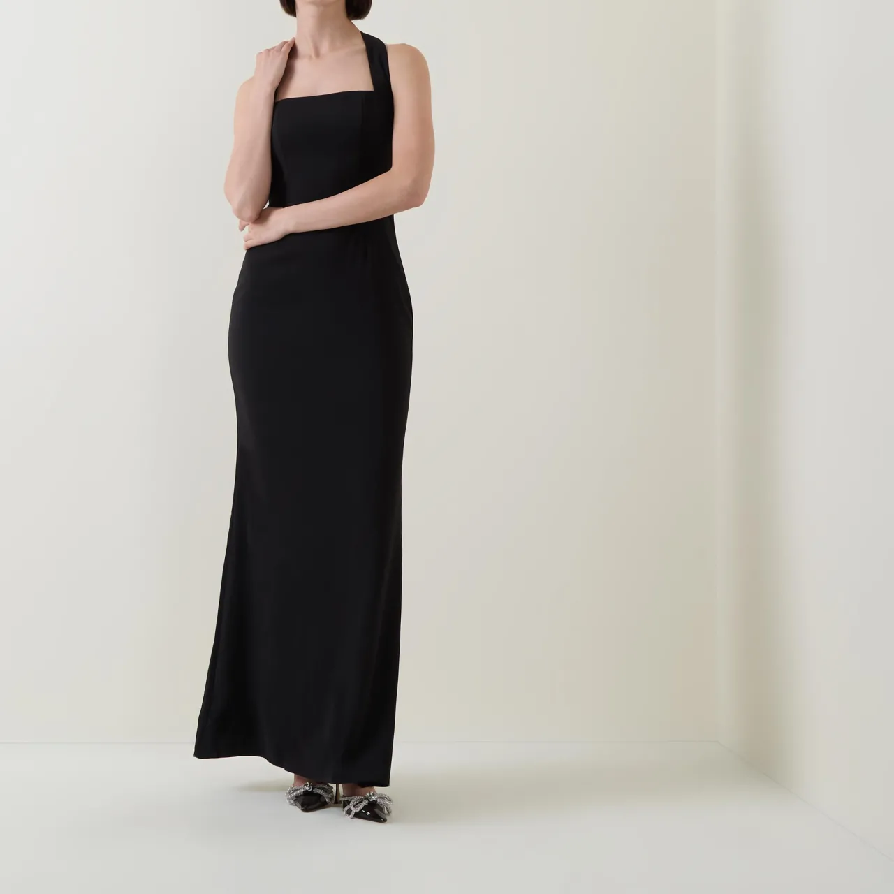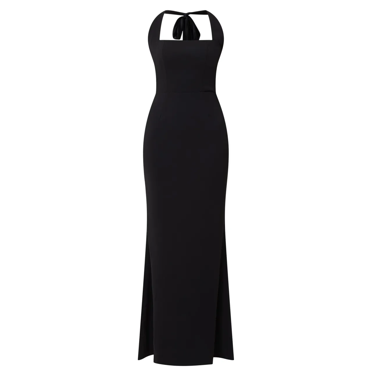 - Square neckline, halter tie fastenings, back zip fastening, darts, cinched waist, flared hem