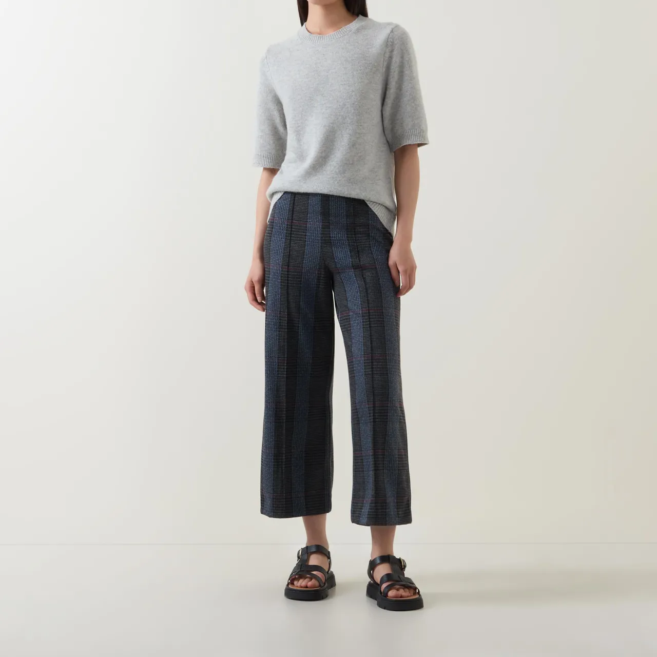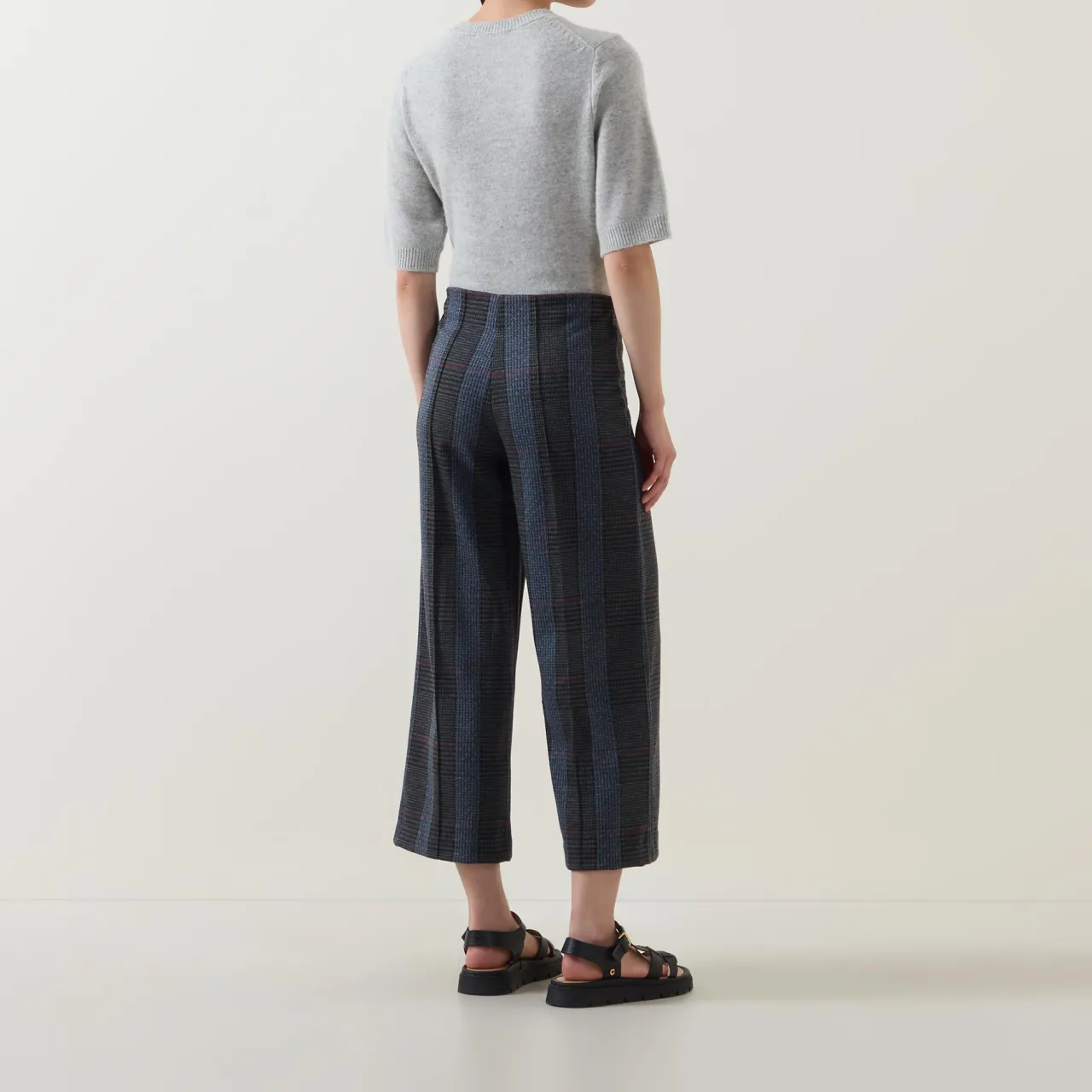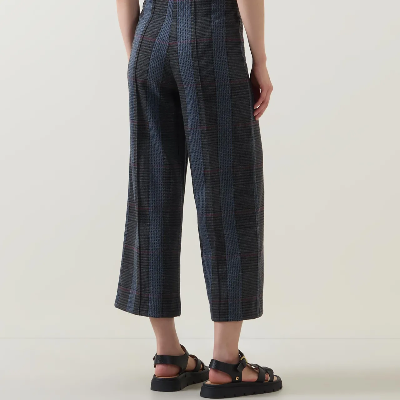 - Mid-rise, wide leg, cropped length, pull-on style, clean hems, tonal check print pattern