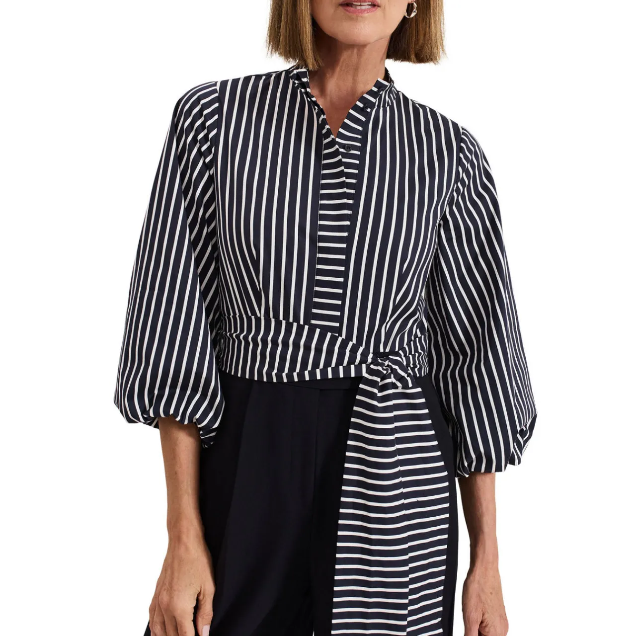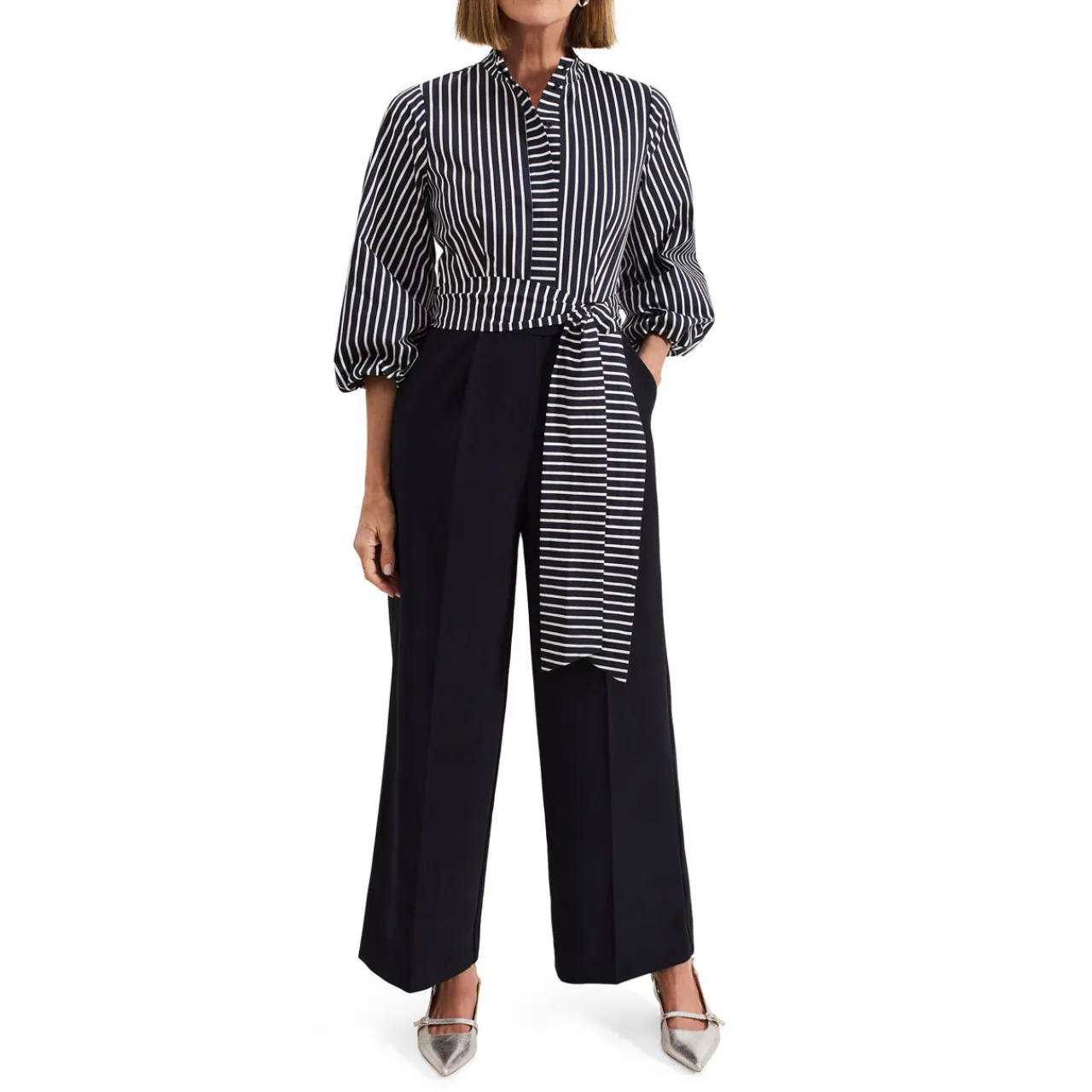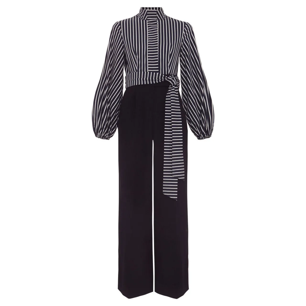 - Contrasting stripes, three-quarter-length puff sleeves, waist tie detail, wide-leg silhouette, front button fastenings, high band collar