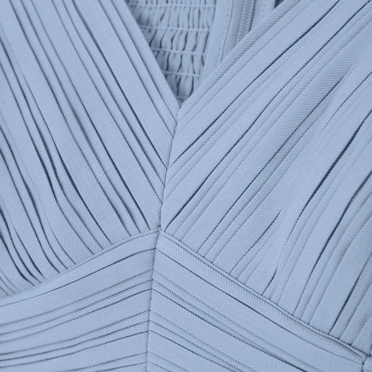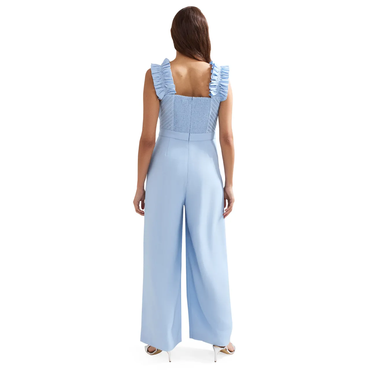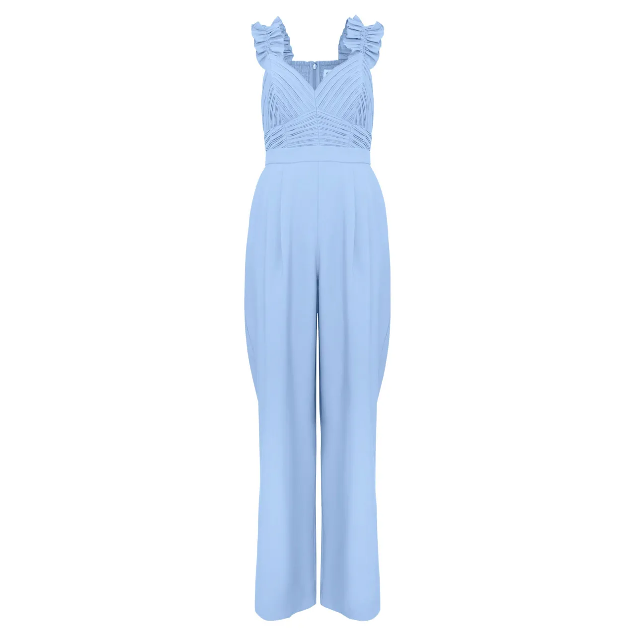 - Wide-leg silhouette, pleated bodice detailing, exaggerated frill sleeves, concealed zip fastening, straps