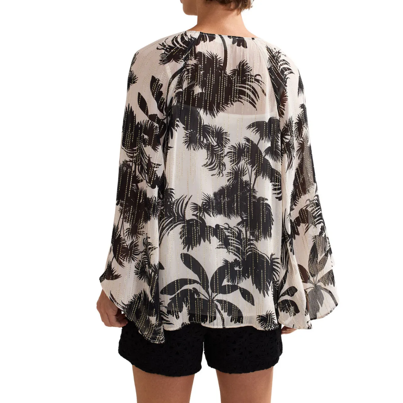 - Tropical palm print, shimmering gold-tone detailing, lightweight, long angled sleeves, no fastening