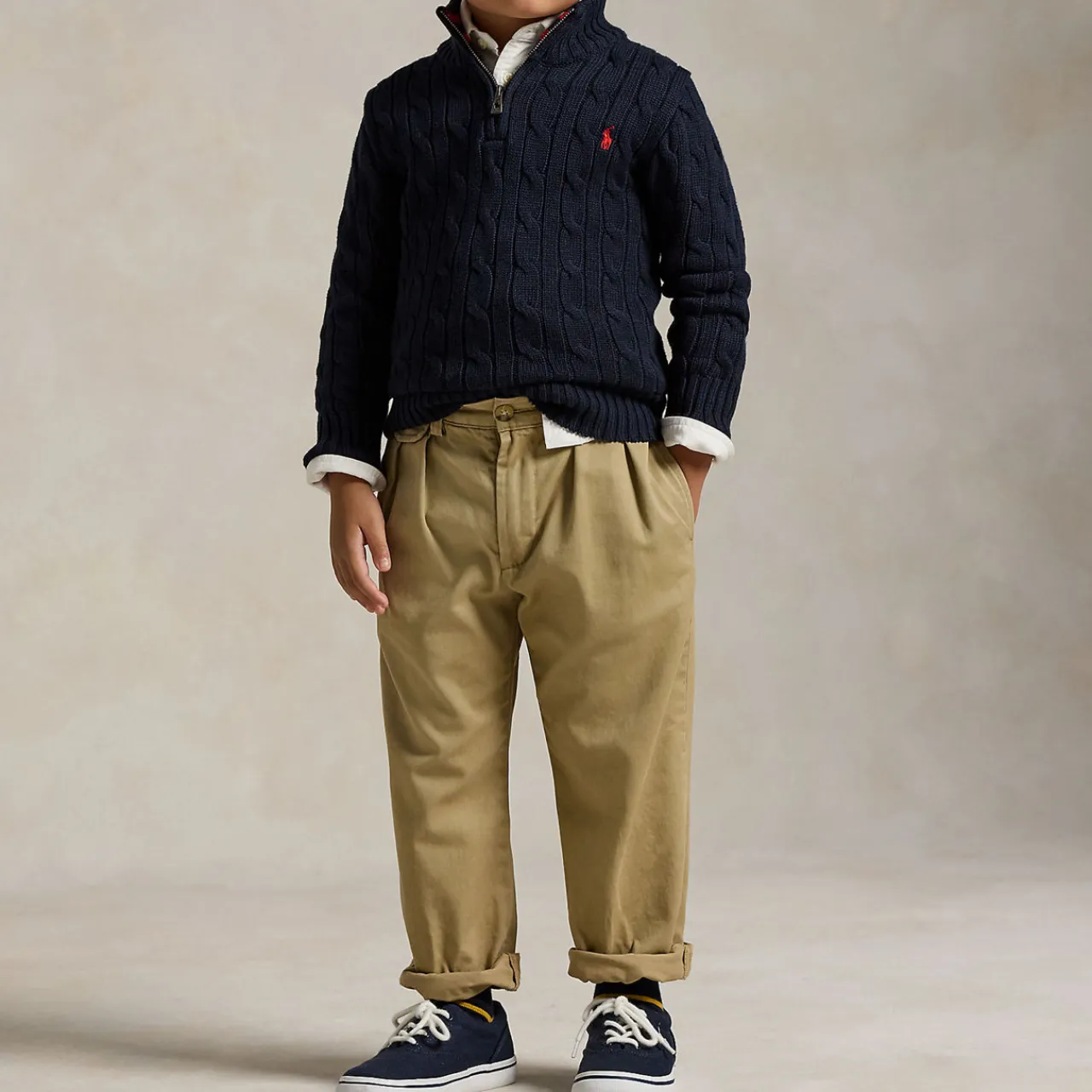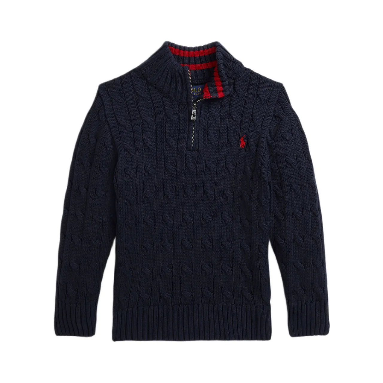 - Rib-knit mockneck with striped facing, quarter-zip placket, long sleeves with rib-knit cuffs, rib-knit hem, signature embroidered Pony at the left chest