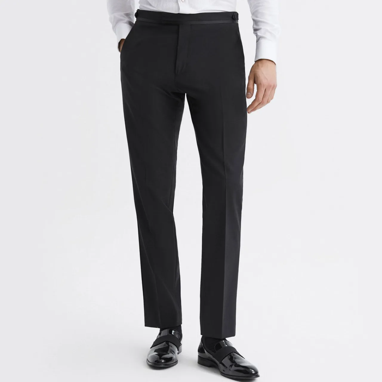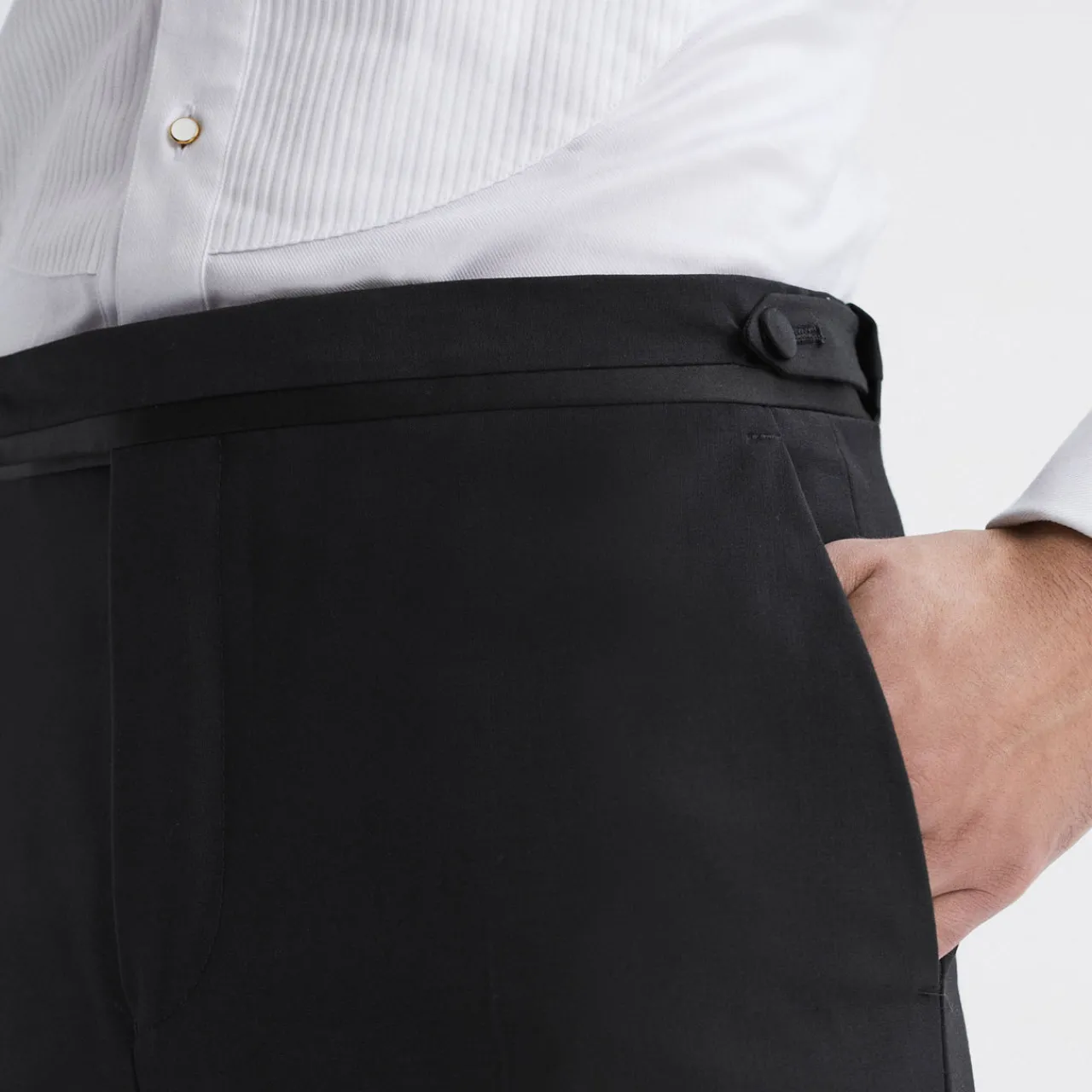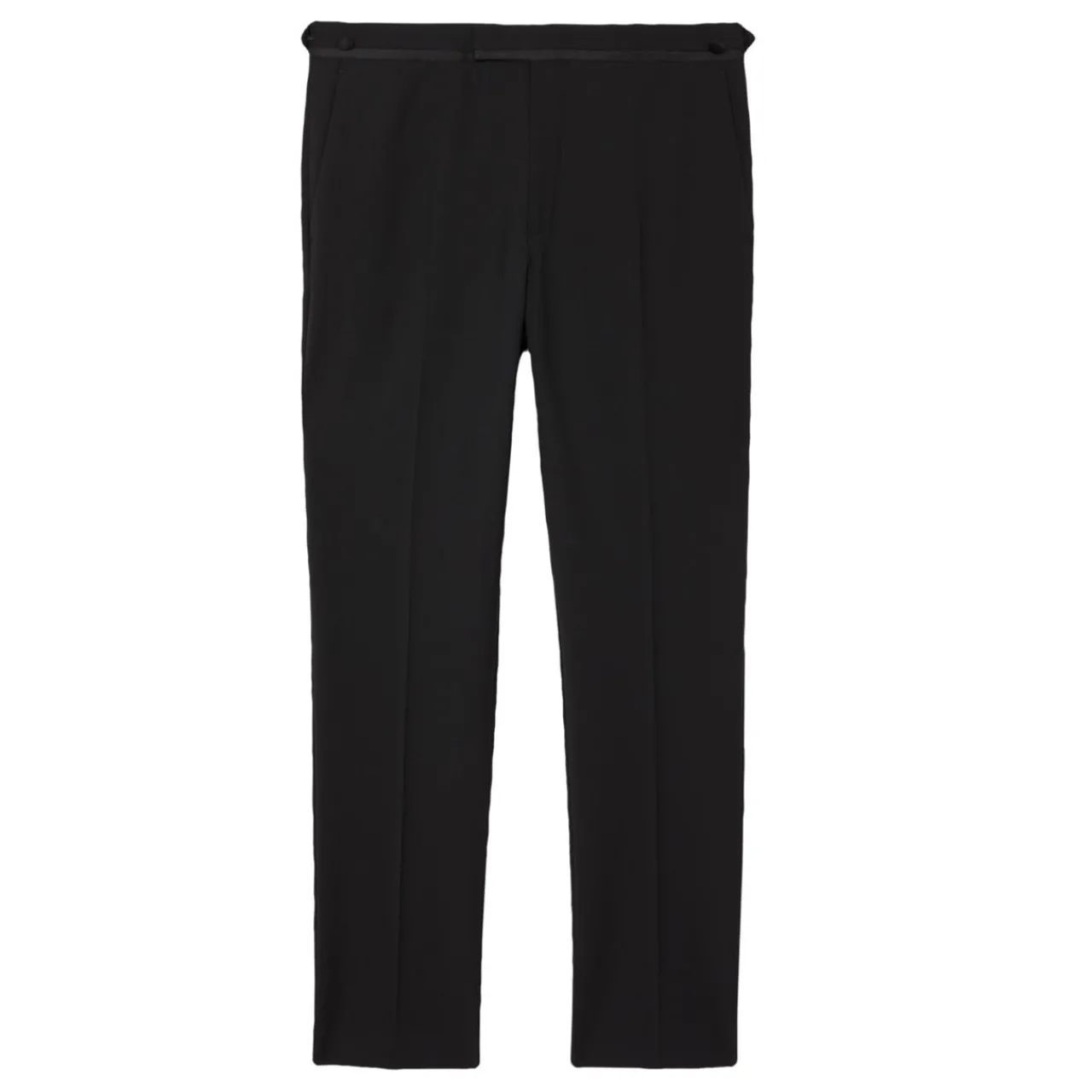 - Liquid repellent, crease-resistant, tailored, contrasting satin trim to the waistband, bi-stretch, spillage and water-resistant, slash pocket to each hip, side adjusters, jetted pockets to reverse, zip fly fastening