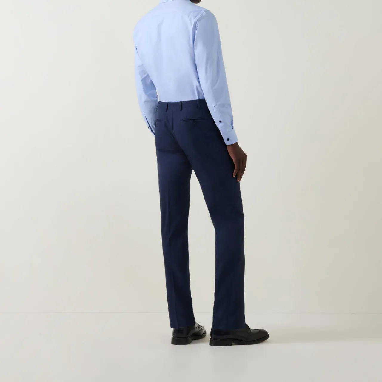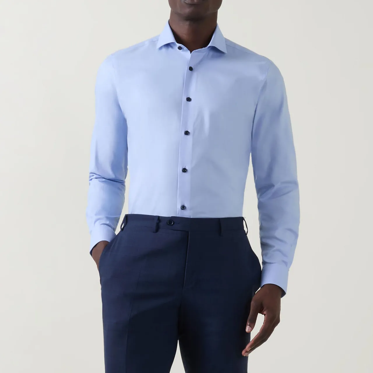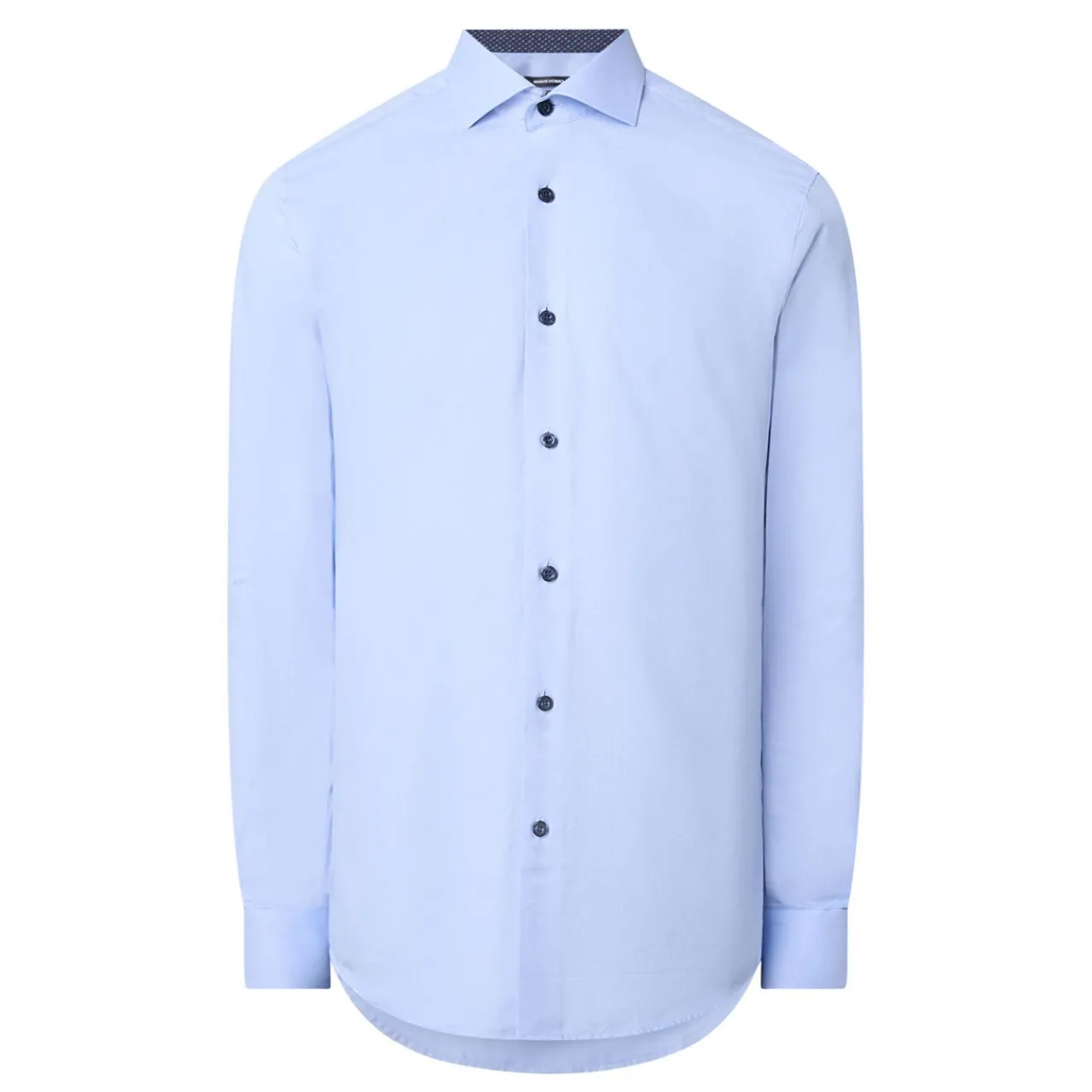 - Pointed collar, long sleeves, button placket, tonal stitching, single-button cuffs, printed pattern on inside trim, curved hemline, smooth fabric