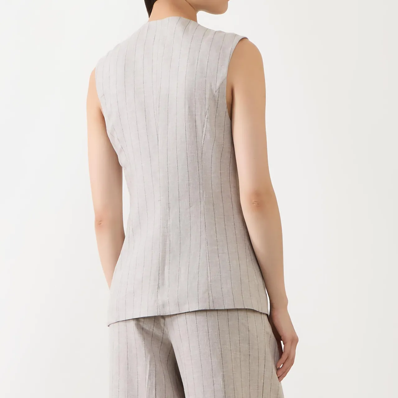 - Round neckline, sleeveless design, front button fastening, dart detailing, two front welt pockets, curved front hem, pinstripe pattern