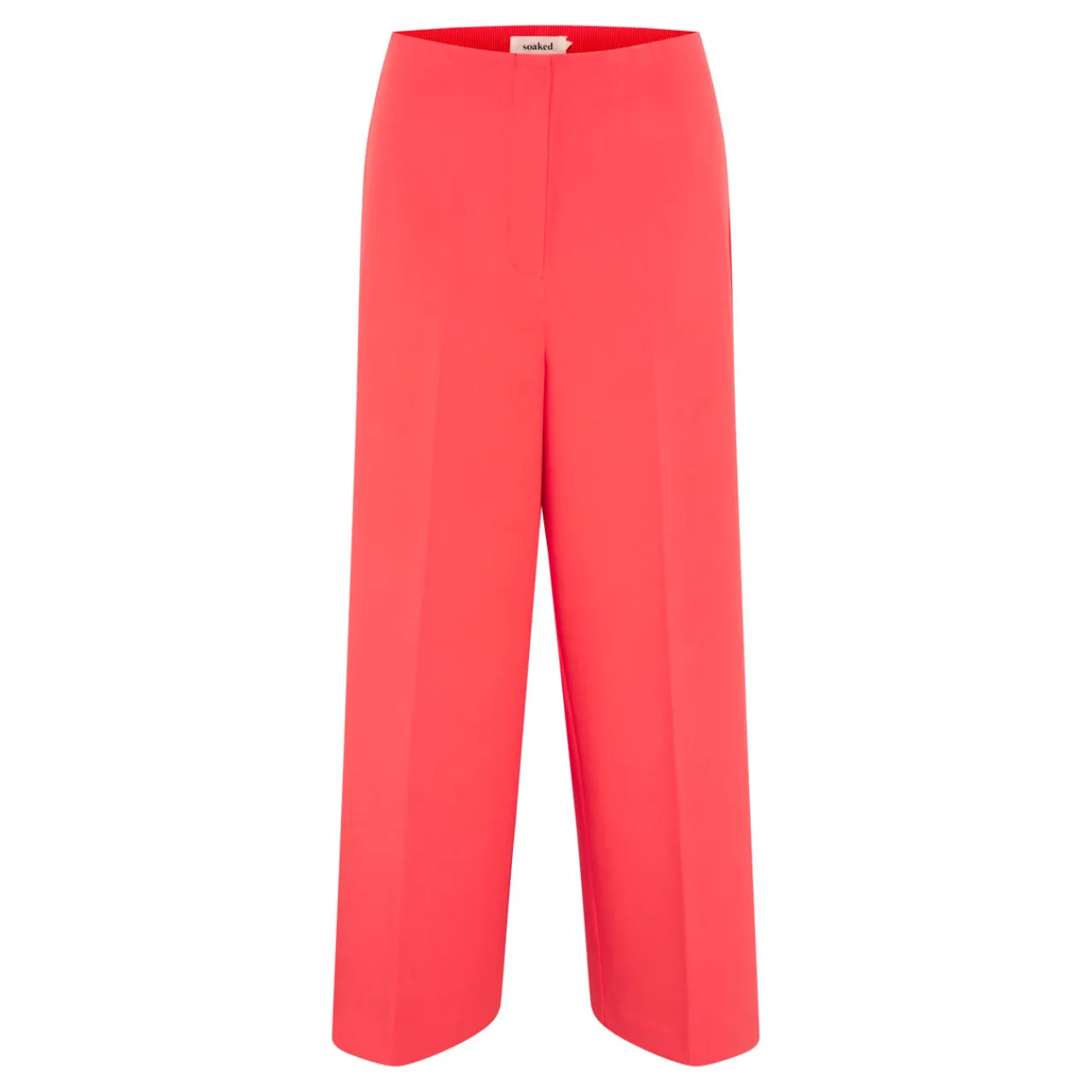 - Flat front, hook and eye with fly zipper fastening, pressed creases, wide-cut legs