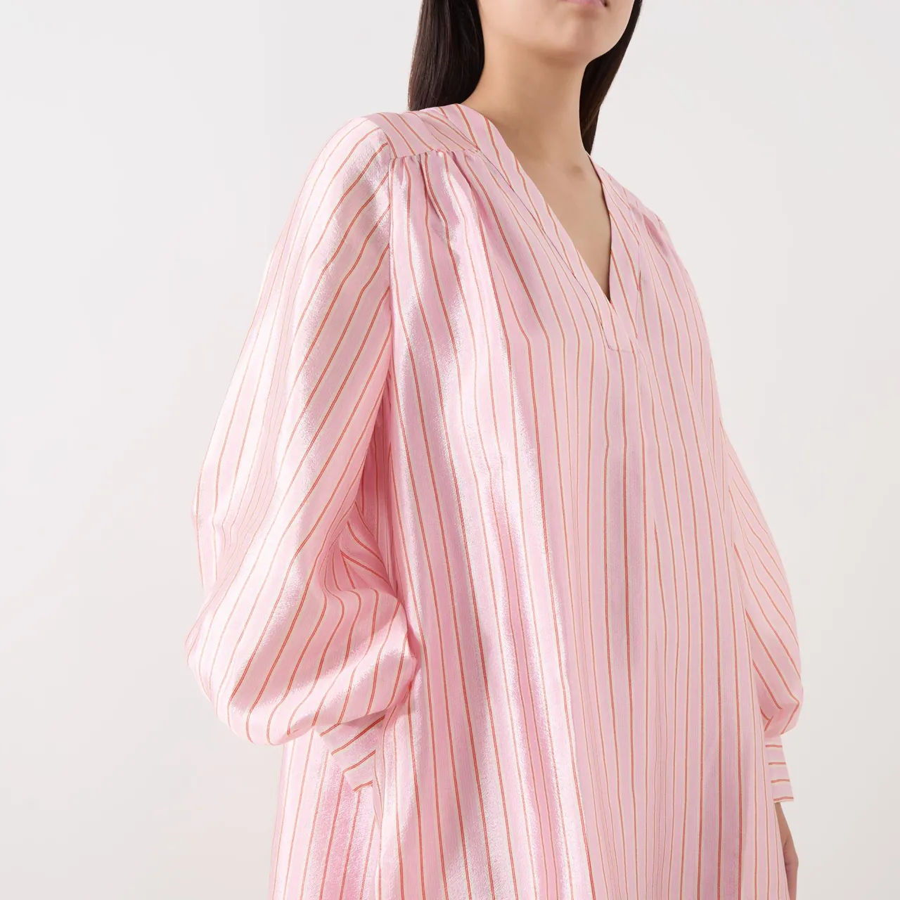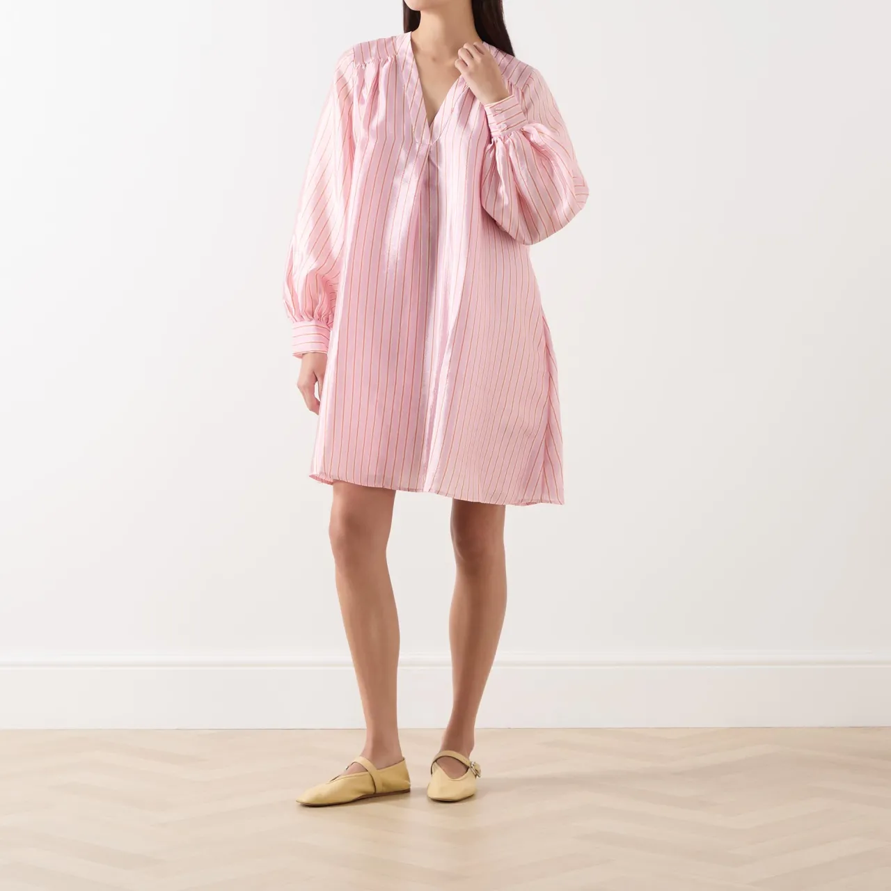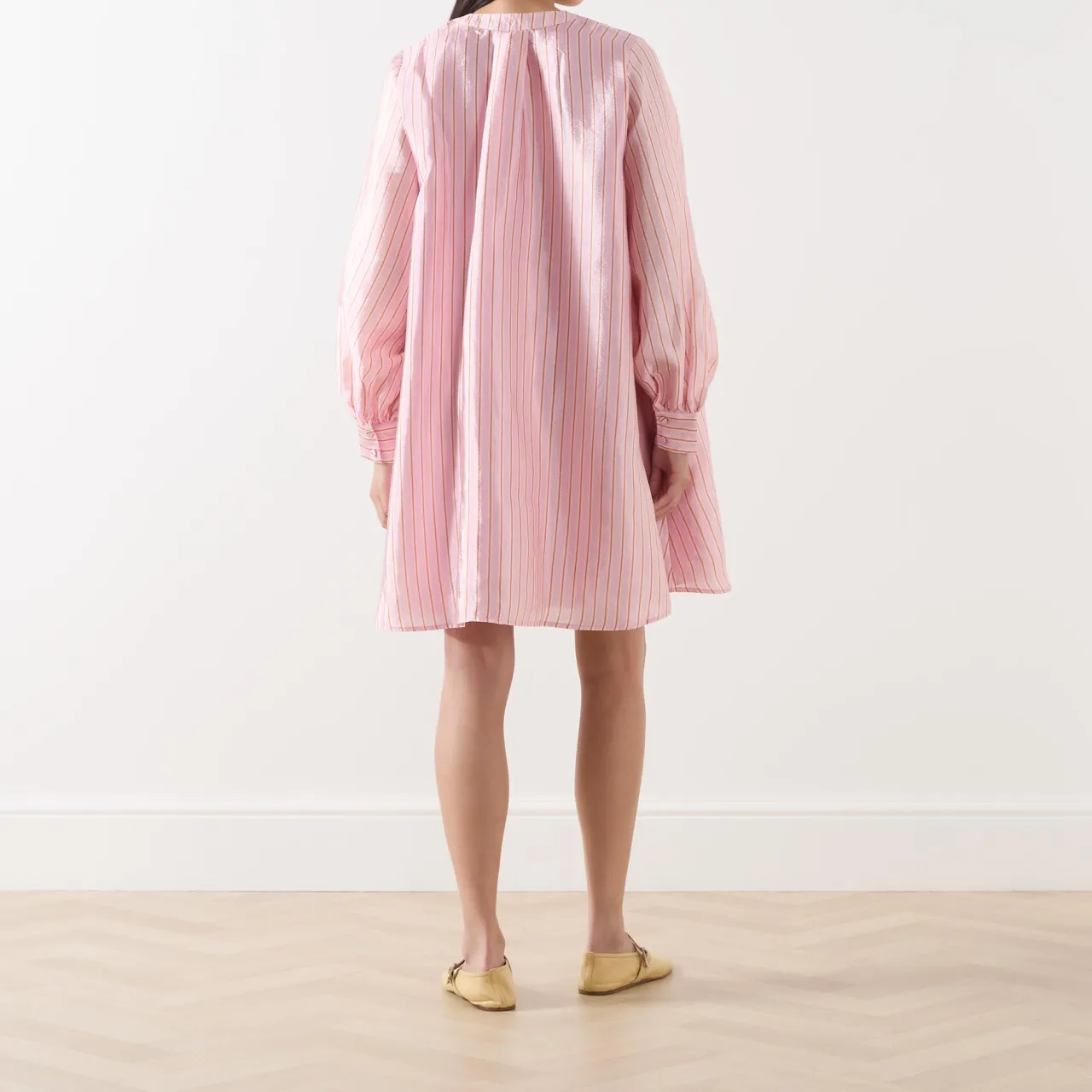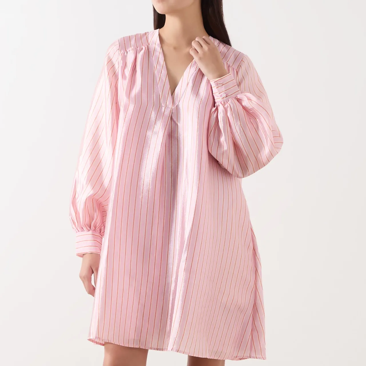 - V-neckline, puffed long sleeves, buttoned cuffs, two side seam pockets, flared hem, tonal pinstripe design, mini length