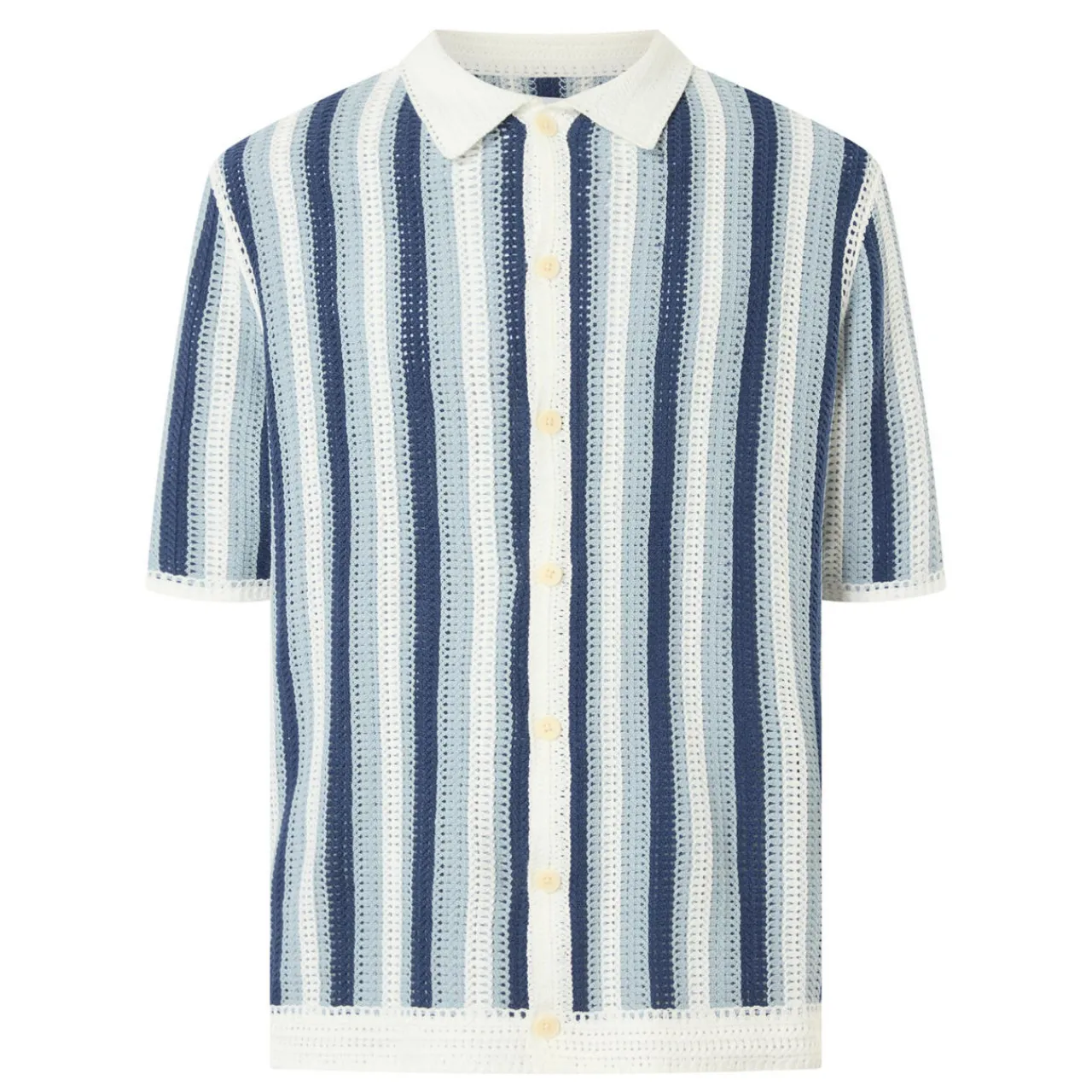 - Short sleeves, spread collar, button fastening placket, contrasting striped design, straight hemline, woven knitted finish