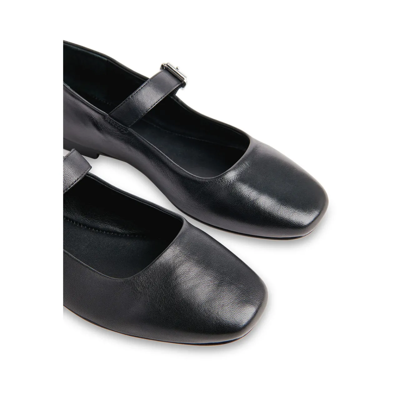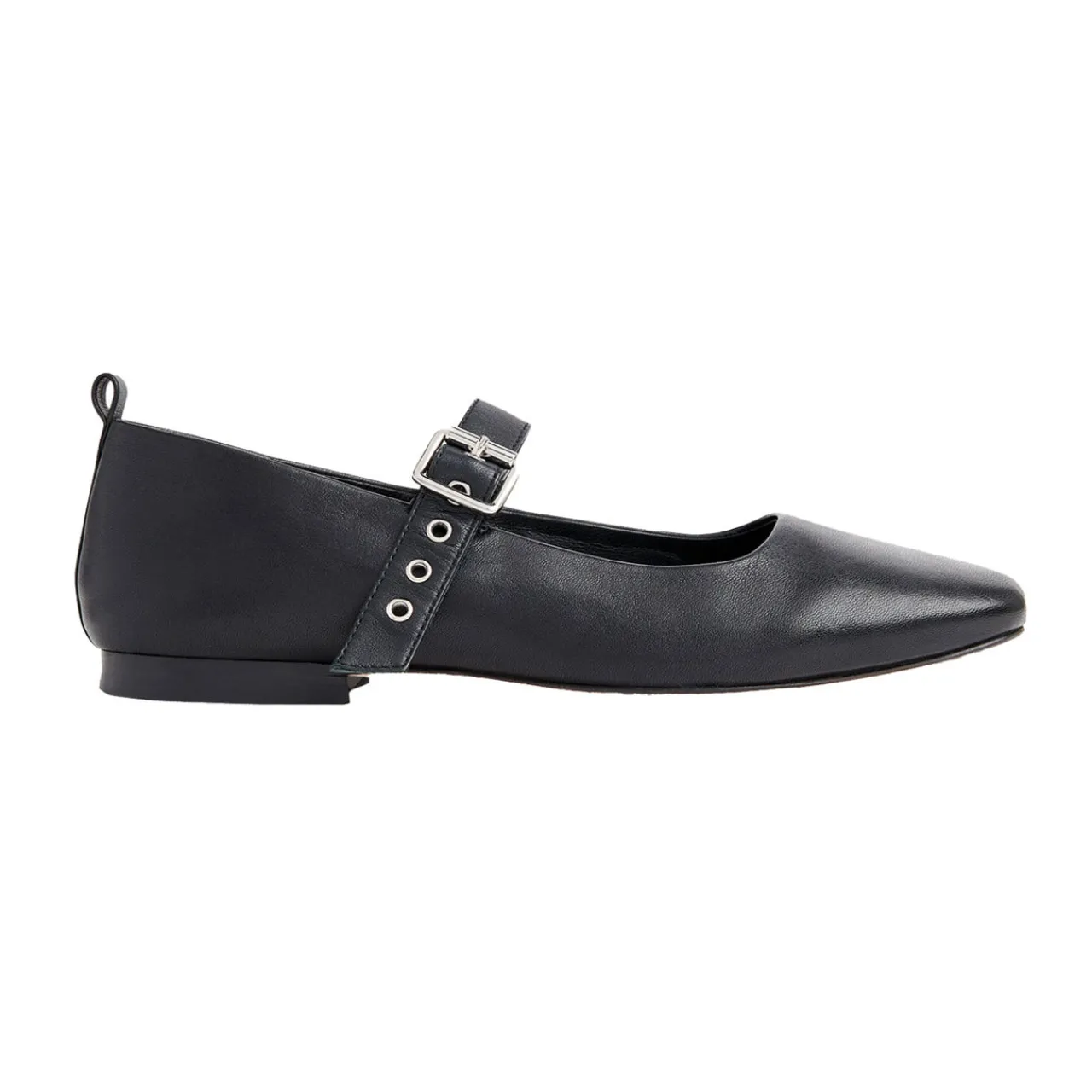 - Squared toe, strap with buckle fastening, adjustable fit, pull tab at heel, silver-tone hardware, grained finish
