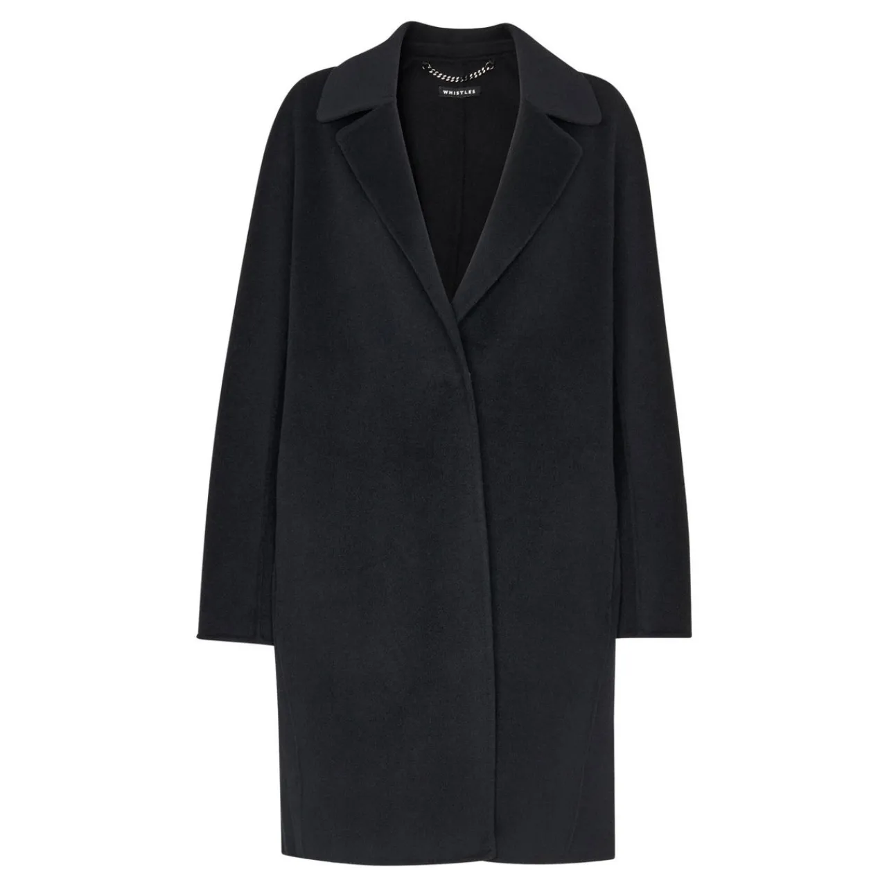 - Notched lapels, concealed button fastening, raglan-style sleeves, side entry pockets