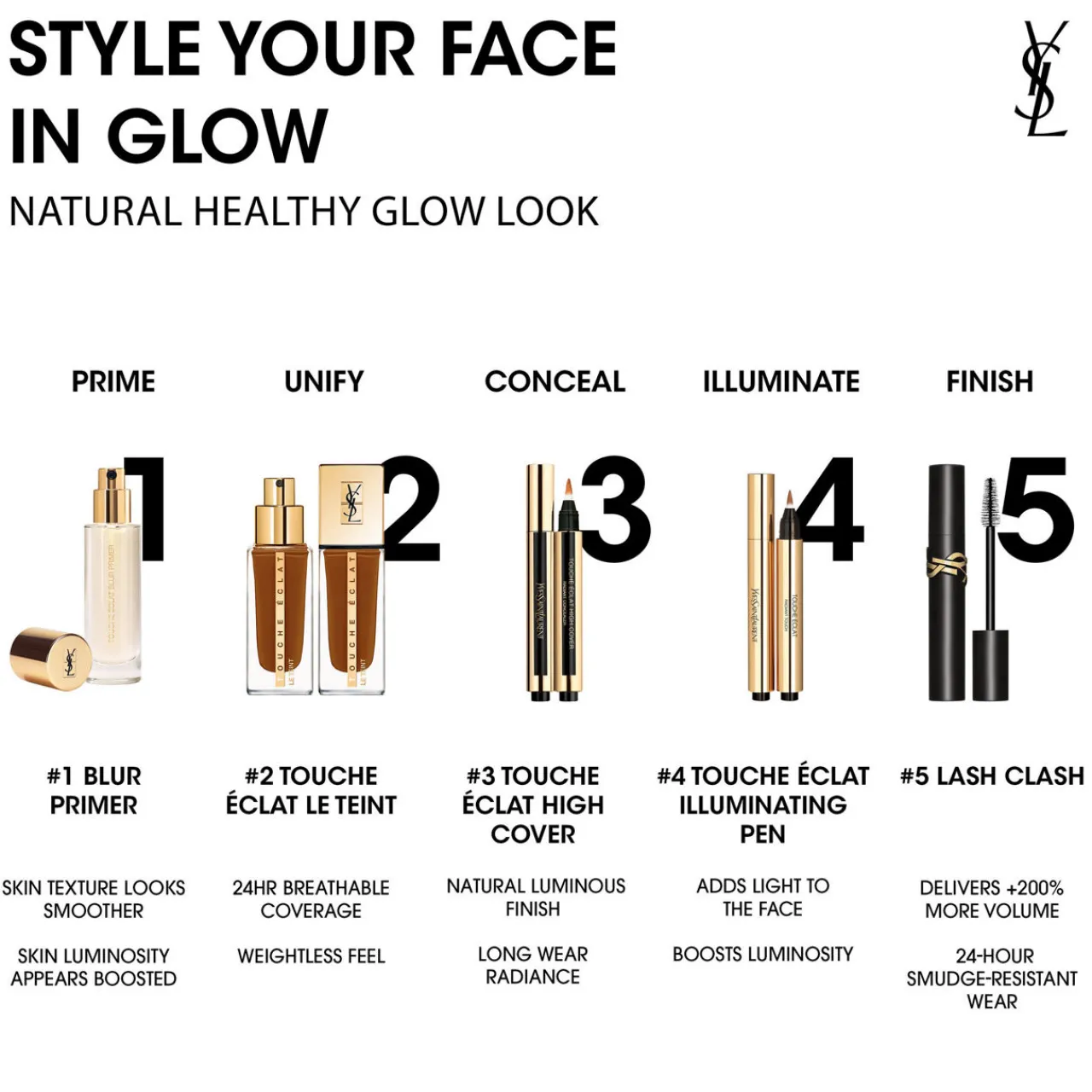 - How to Use: Pump two drops of Touche Éclat Le Teint into the ‘Y’ signature reservoir of the Y-BRush. Dab the texture on the cheeks, forehead and chin, and blend using circular movements from the centre of the face outwards. Use the side for the BRush to smooth the foundation onto the lower eyelids, nostril area and nose. For a more blendable application, apply one drop first, followed by a second drop of the full coverage foundation to finish. If applying with fingertips, apply with gentle sweeping motions from the centre of the face outwards. For the final radiant touches to your complexion, highlight and conceal with YVES SAINT LAURENT’s iconic Touche Éclat Illuminating Pen