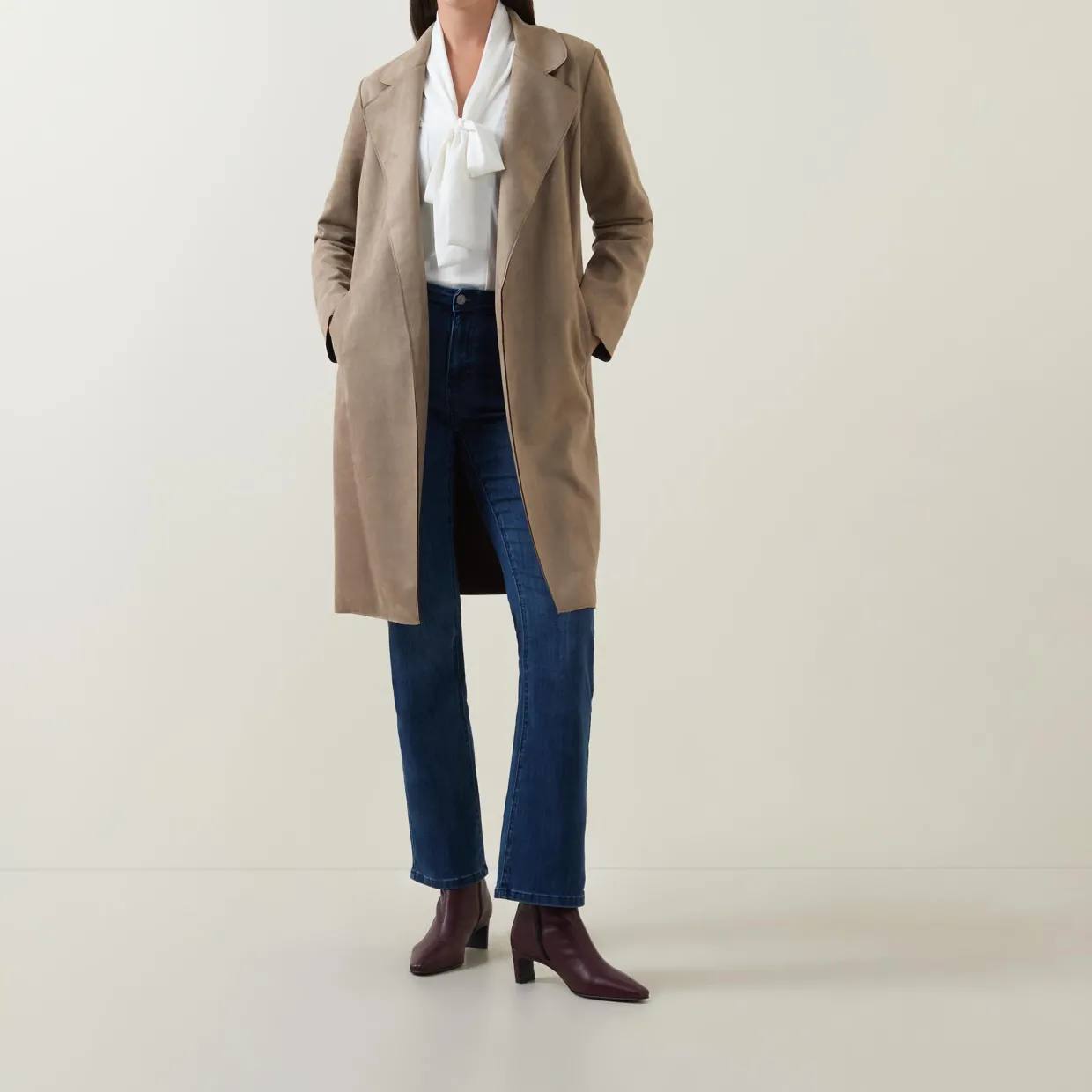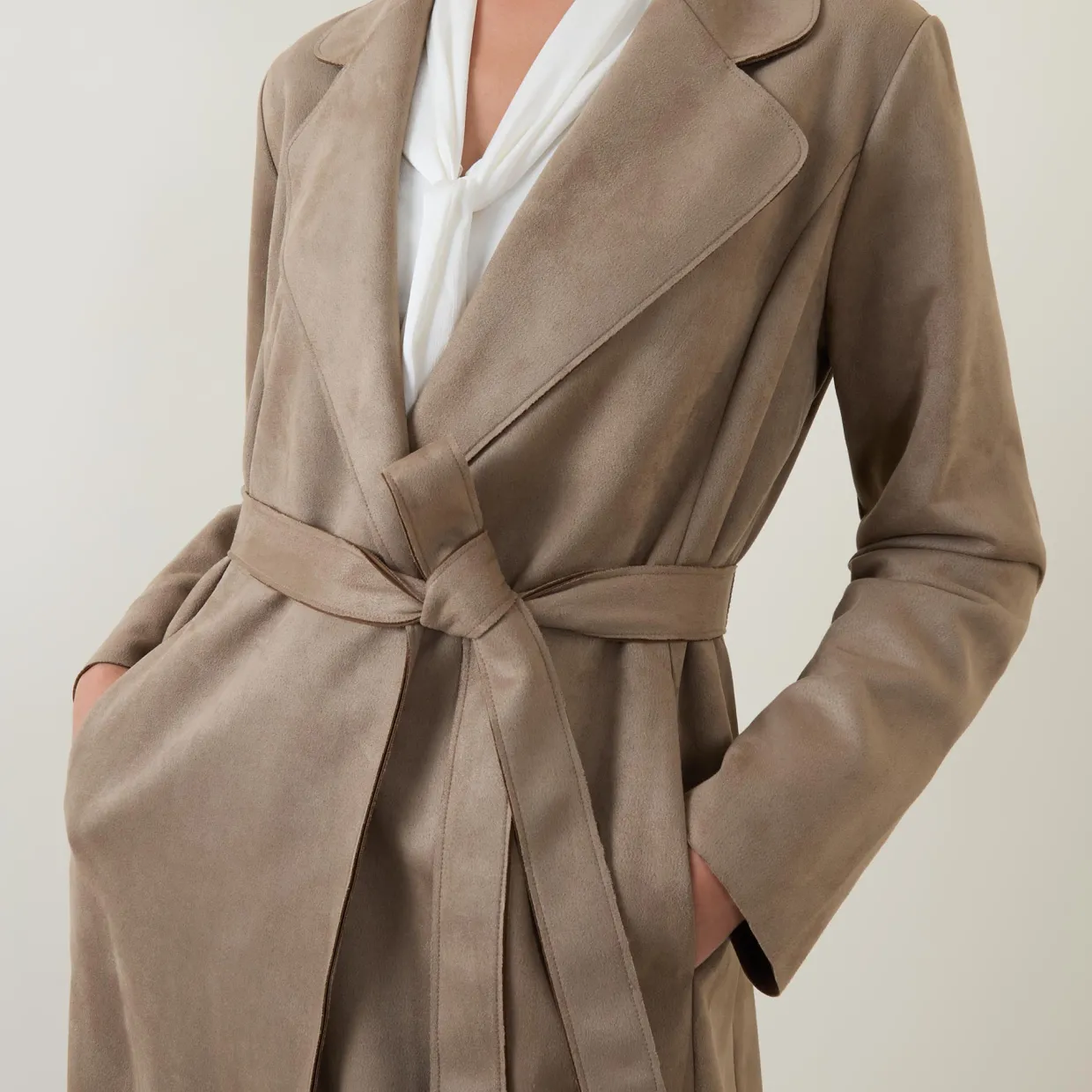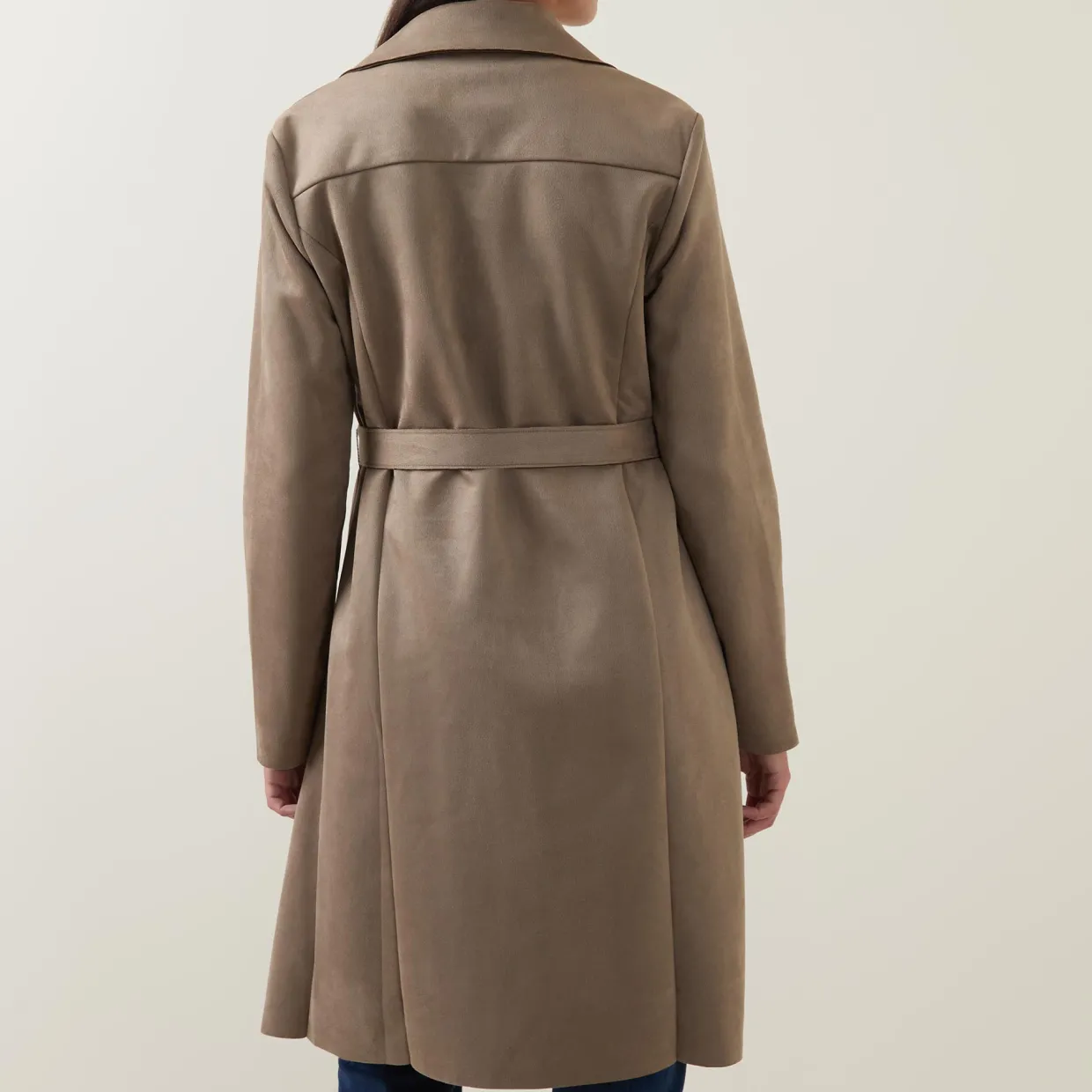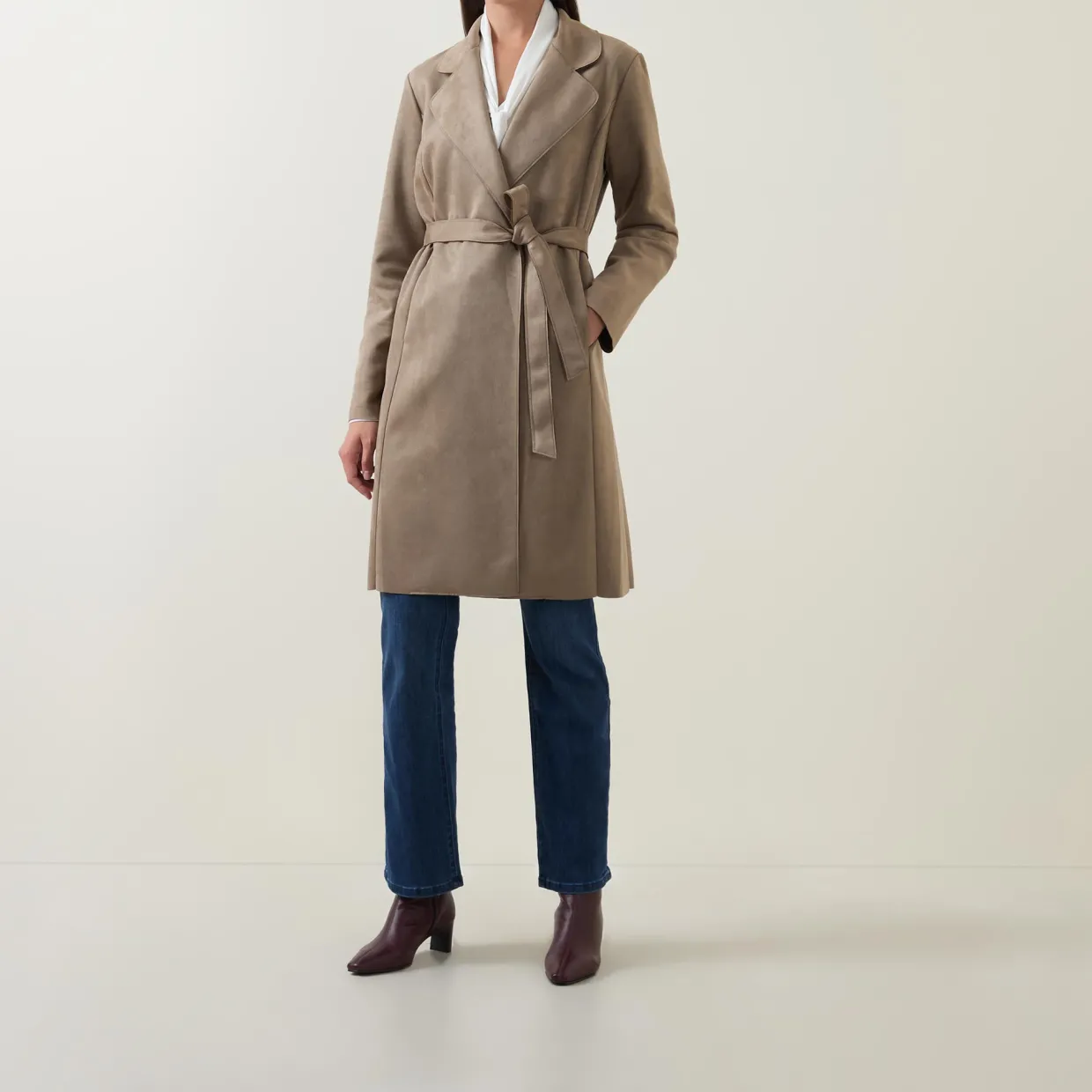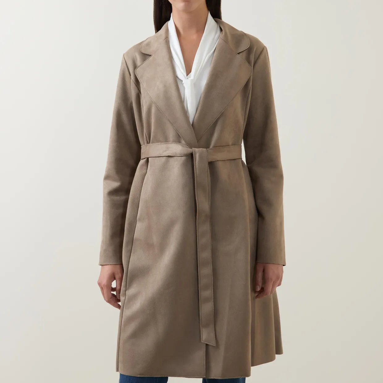 - Wrap-style design, notch lapel collar, long sleeves, matching self-tie waist belt, two side entry pockets, straight hem, mid length, faux suede finish
