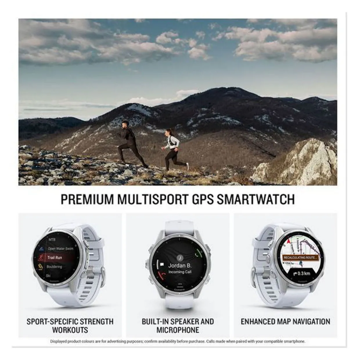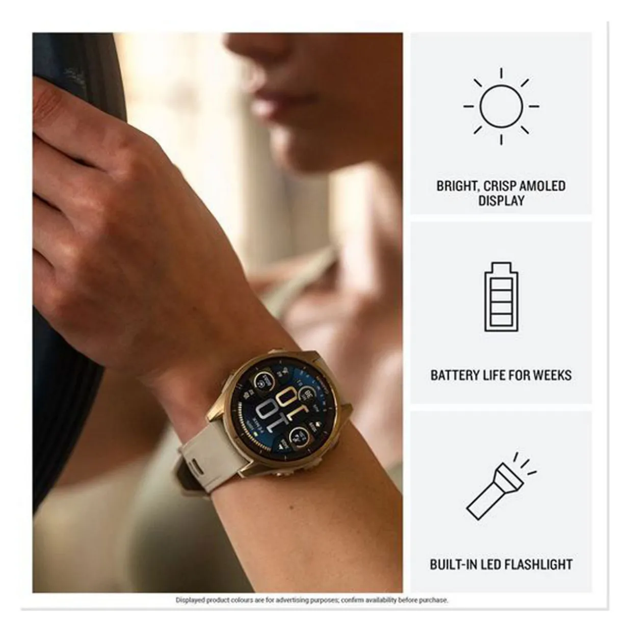 For serious athletes and adventurers who want to push beyond their limits, this premium sports GPS smartwatch is built to perform — with advanced strength training features, dive capability, an internal speaker and mic for voice features, a built-in LED flashlight and compact styling for smaller wrists.