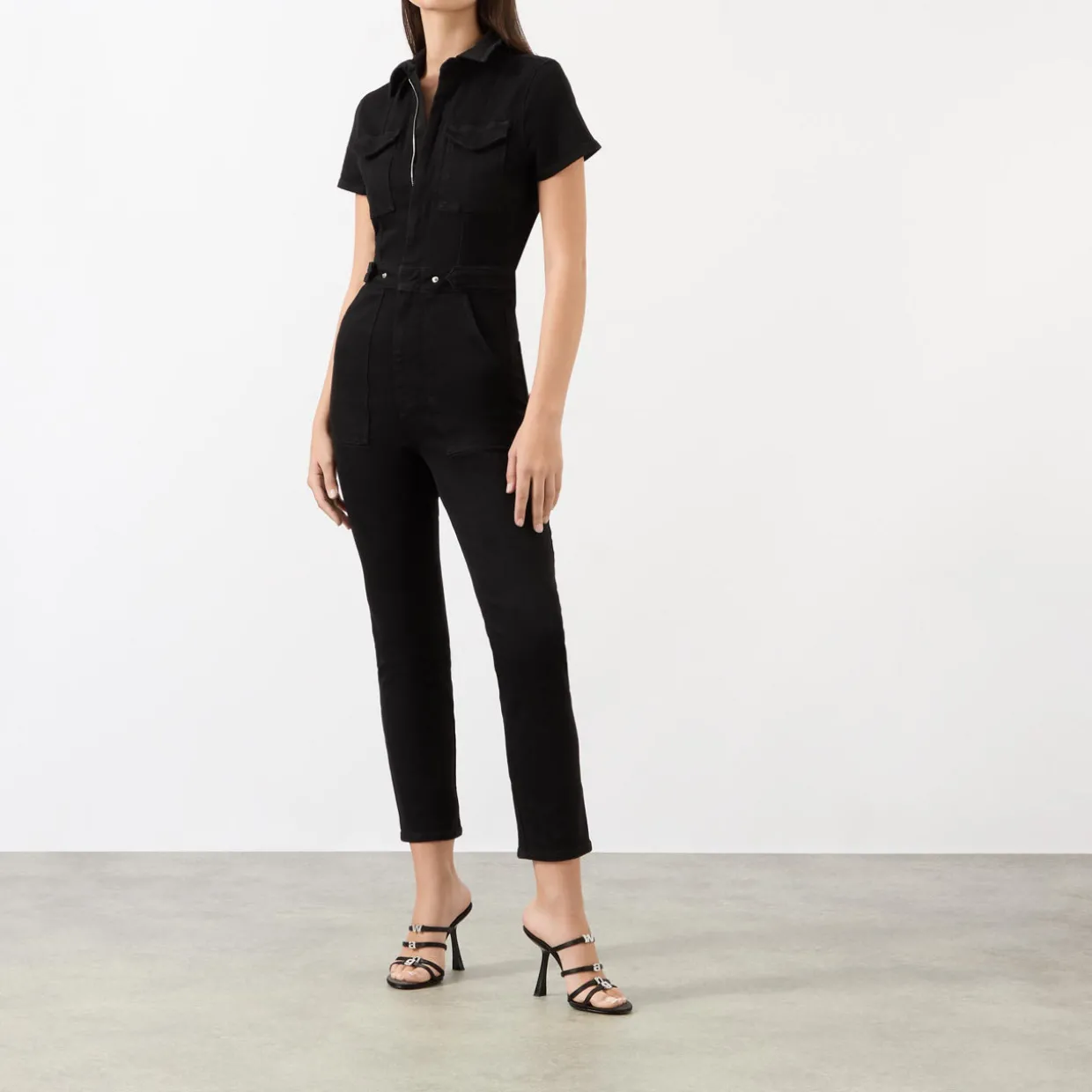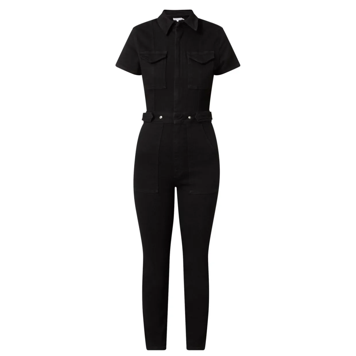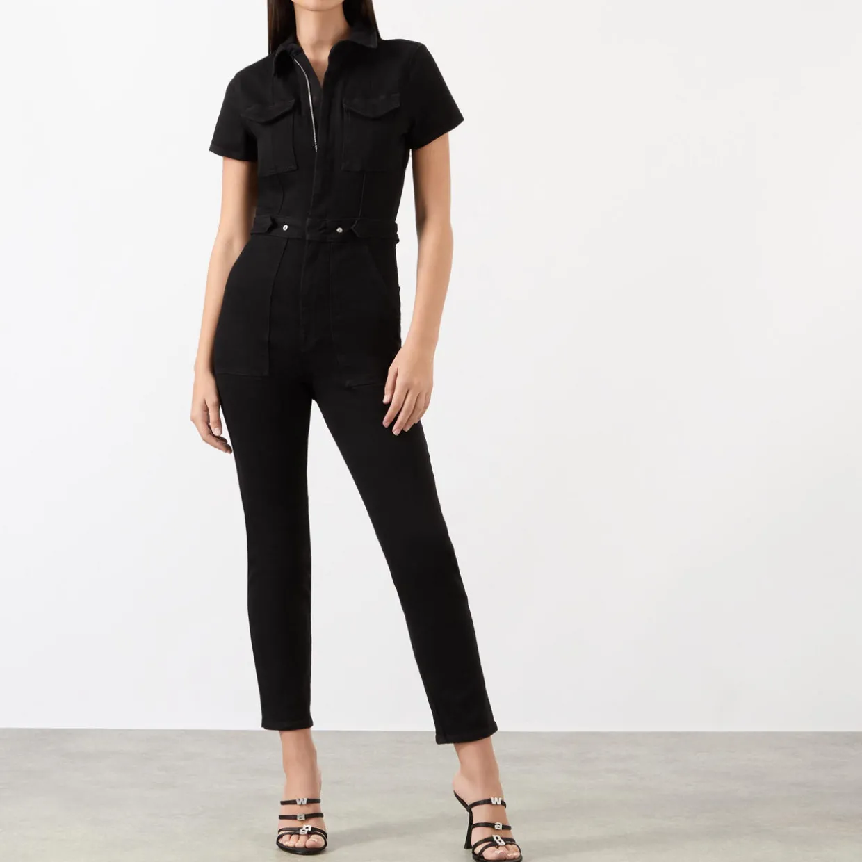 - Pointed collar, capped sleeves, utility chest pockets, front slip pockets, straight leg, whiskering details