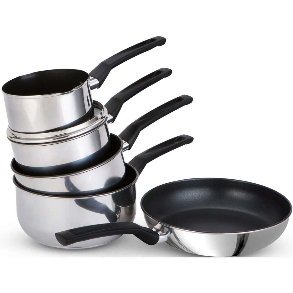 - Set of five, contains a 14cm Milkpan, 16/18/20cm saucepans with a very handy 25cm frypan, stay cool handle is non slip and easy grip, ensures ultimum comfort when cooking, steel base will provide fast and even heat distribution, suitable for all hobs including induction