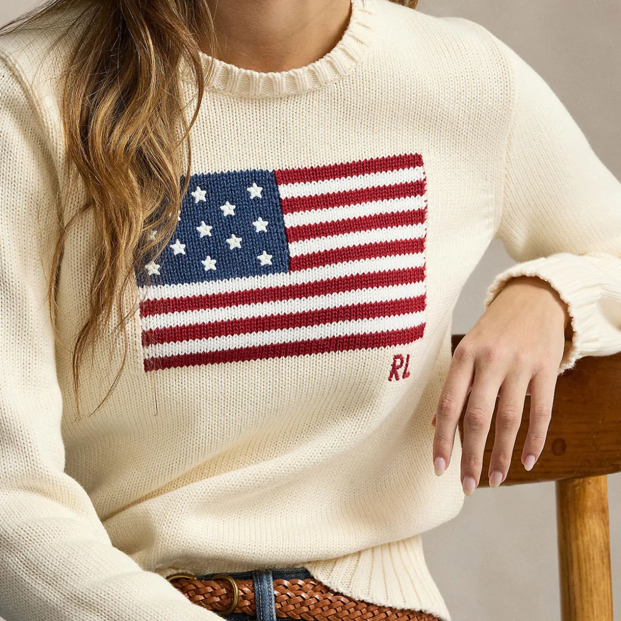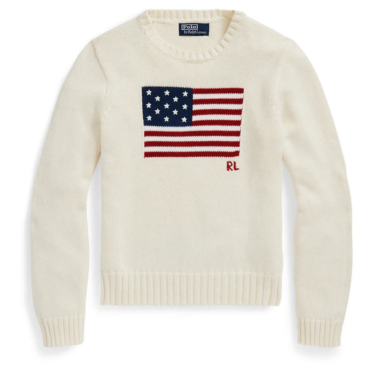 - Crew neckline, long sleeves, ribbed trims, knit structure, flag detail, monogram logo
