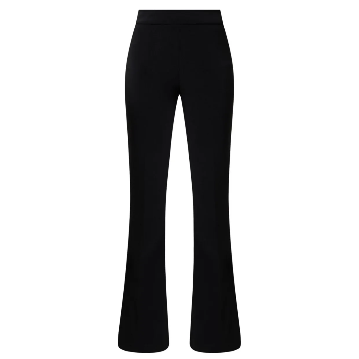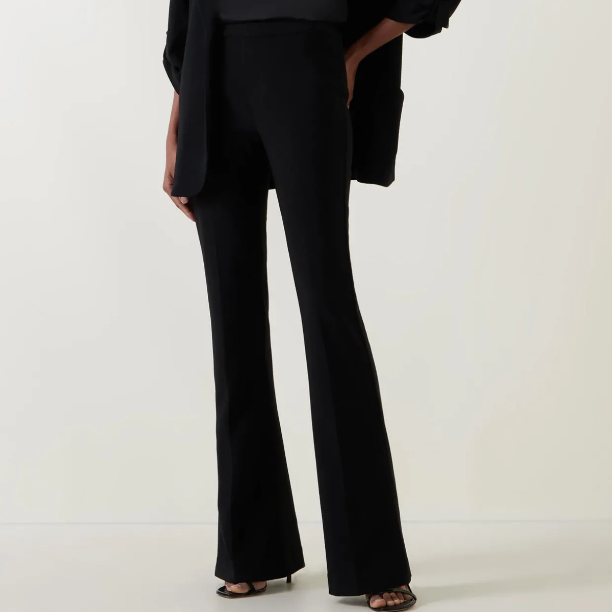 - High-rise, flared-leg, full-length, covered waistband, clean hems, pull-on style, smooth finish