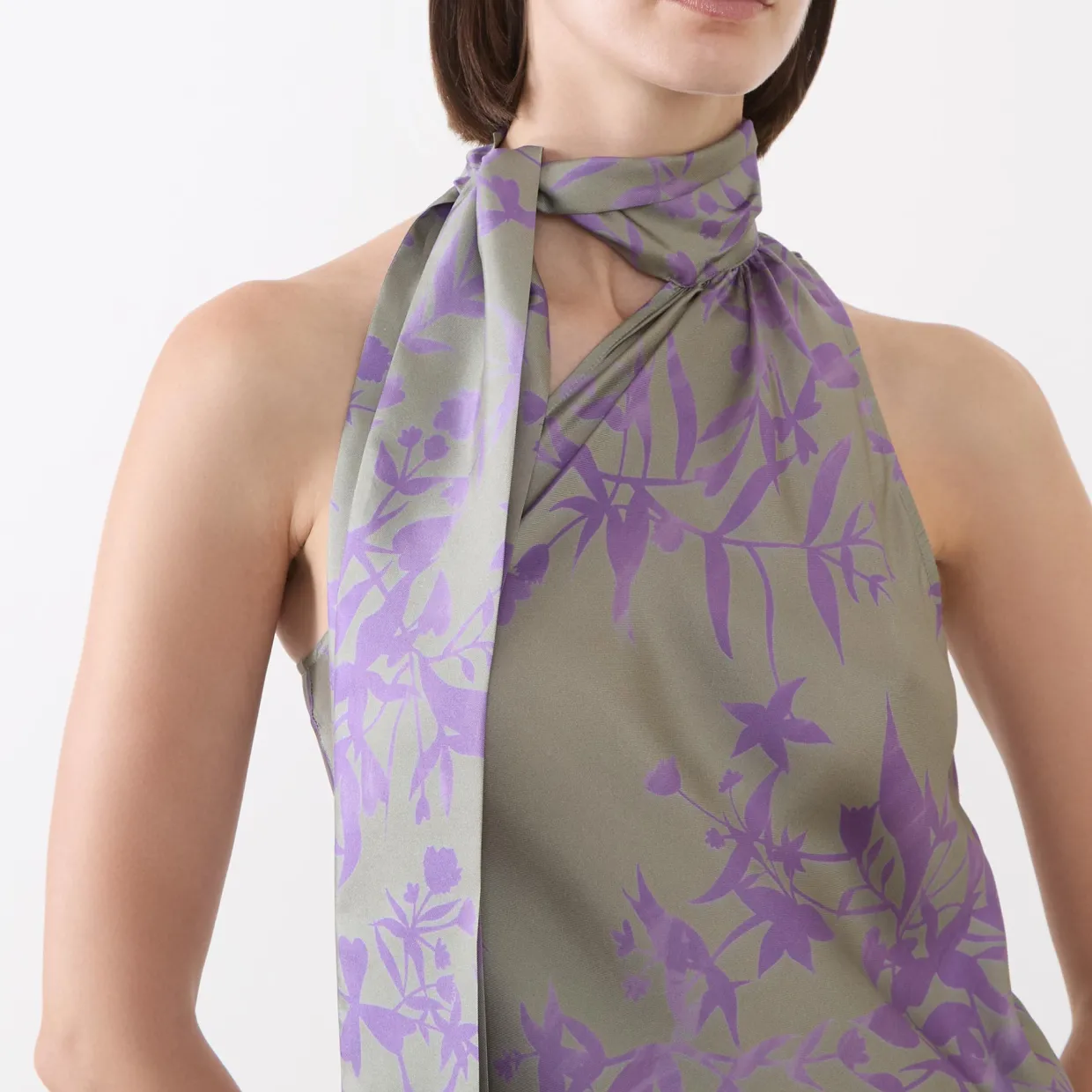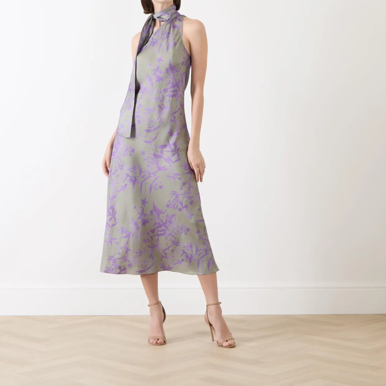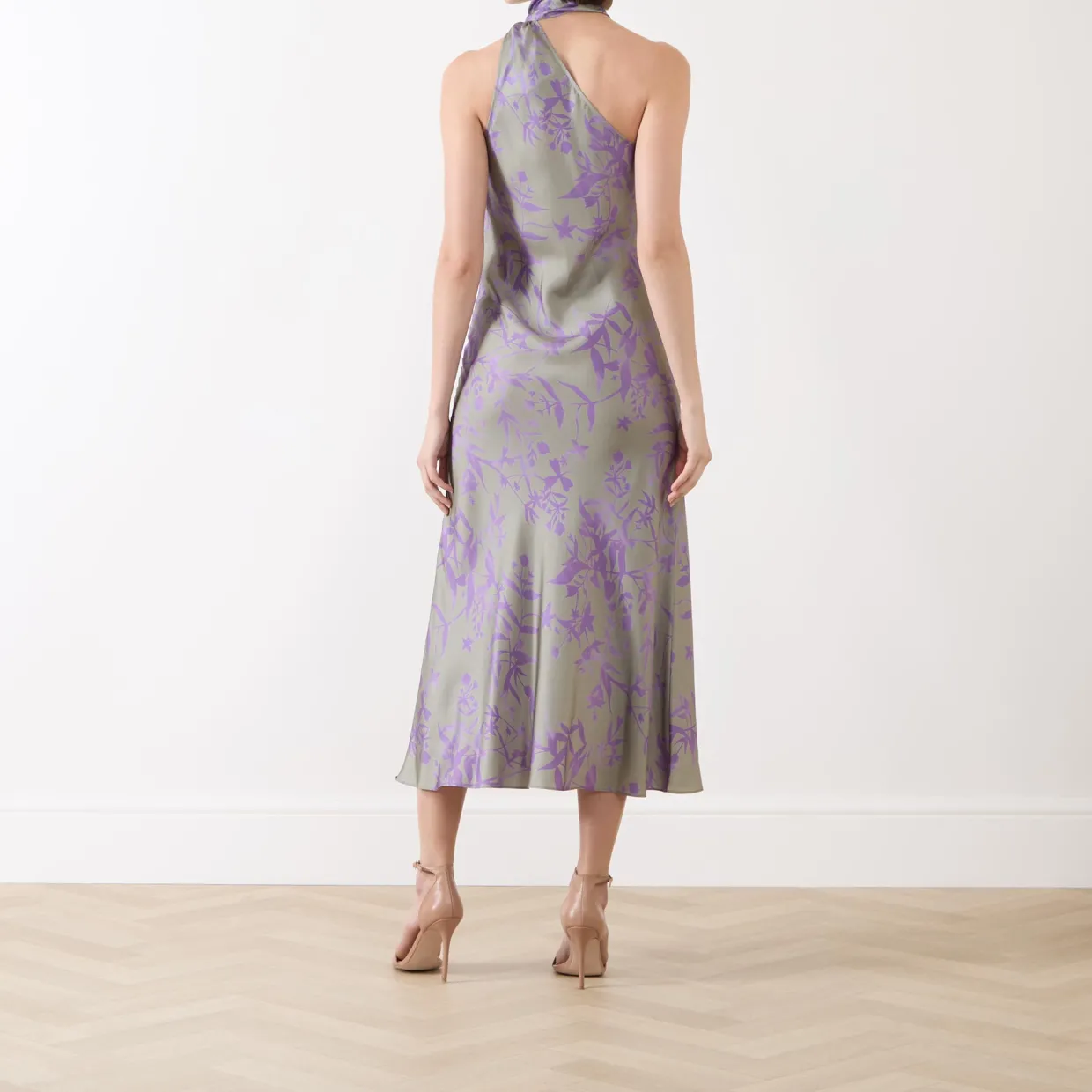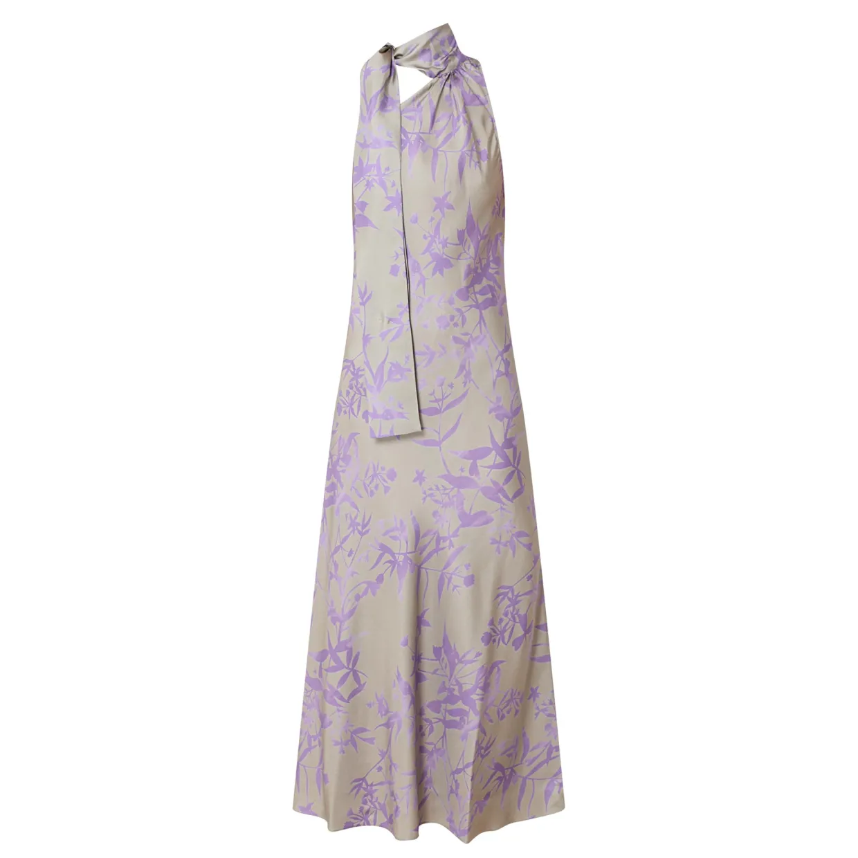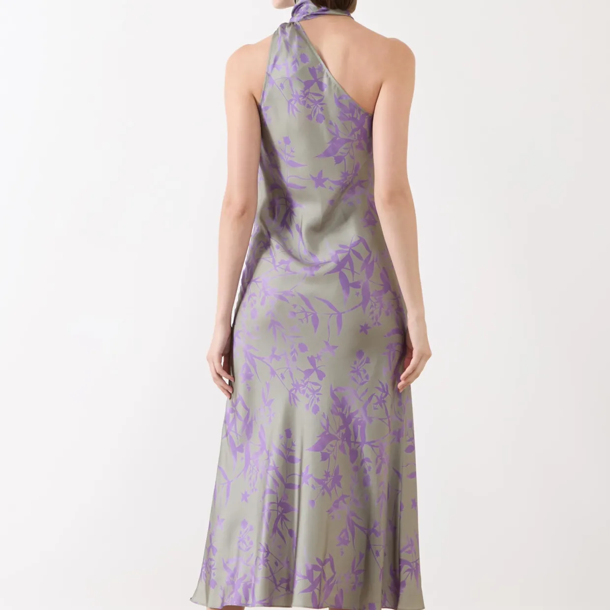 - Asymmetric halter neckline, scarf detail, sleeveless, midi length, floral pattern, bias cut, unlined, silk-twill fabric