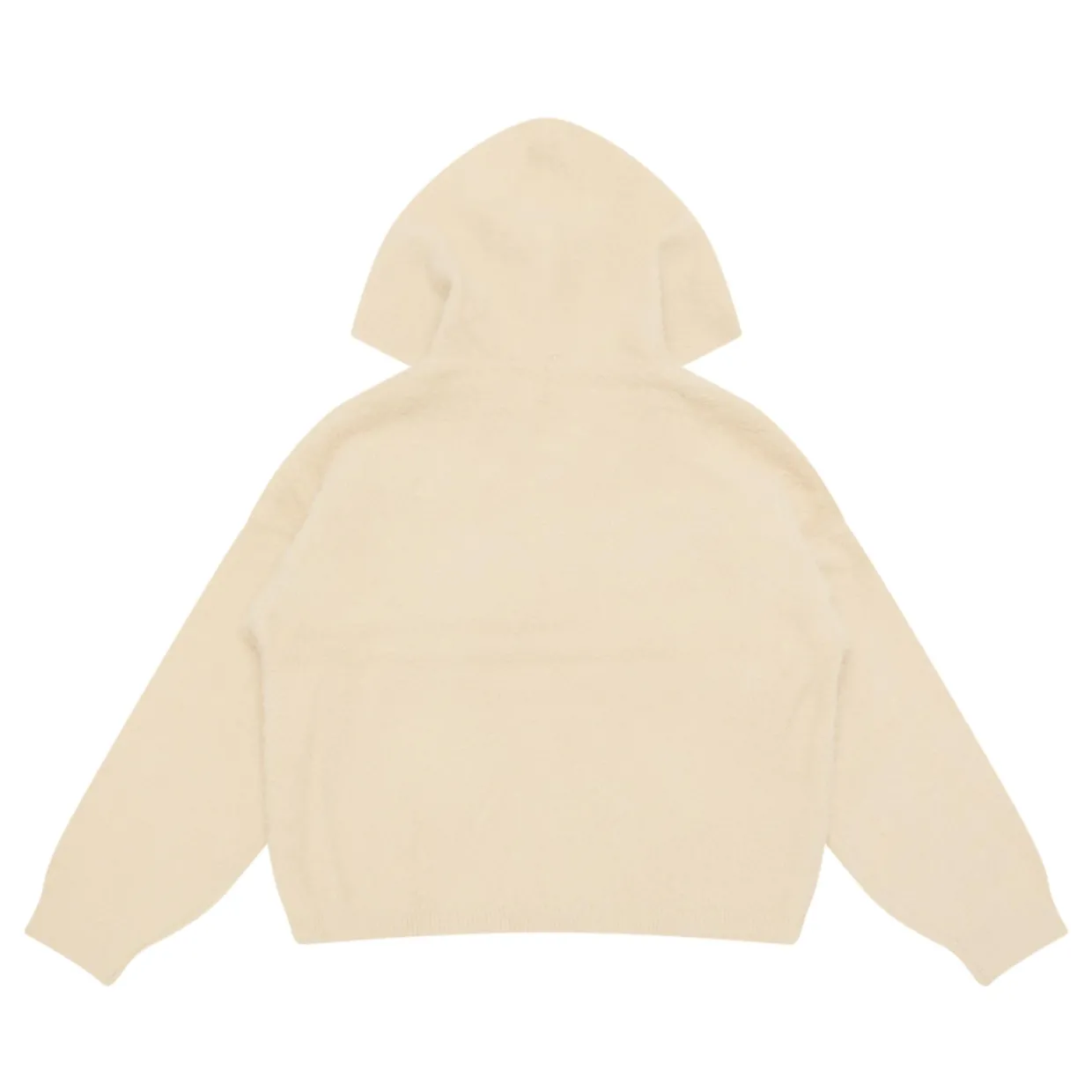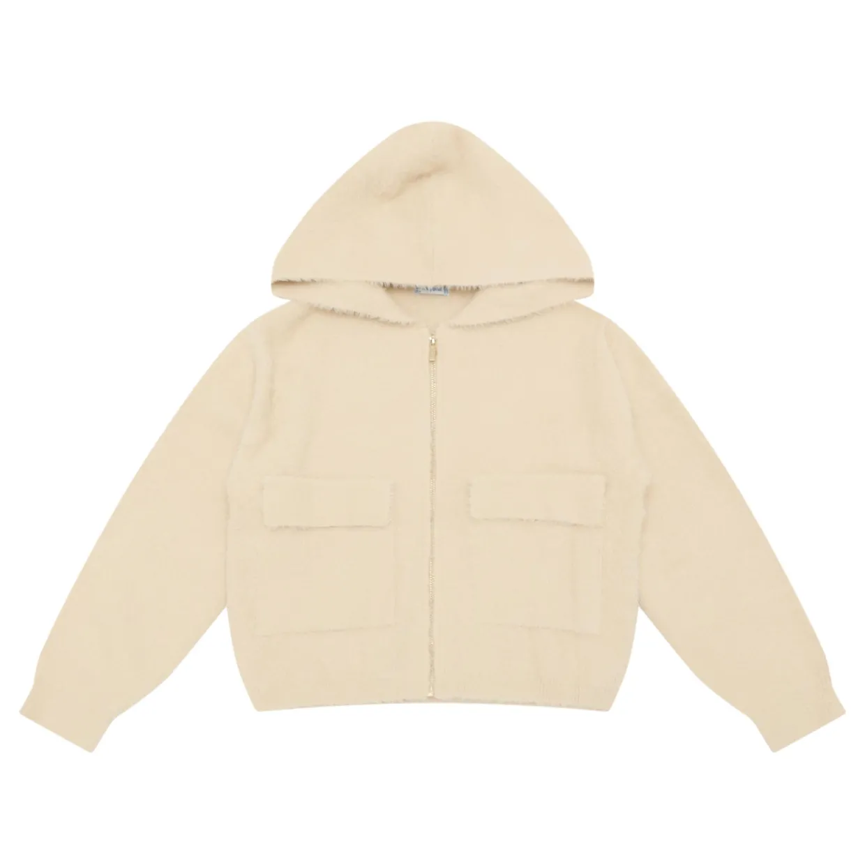 - Fixed hood, long sleeves, front zip fastening, two front flap pockets, straight hem, ribbed trims, fluffy finish