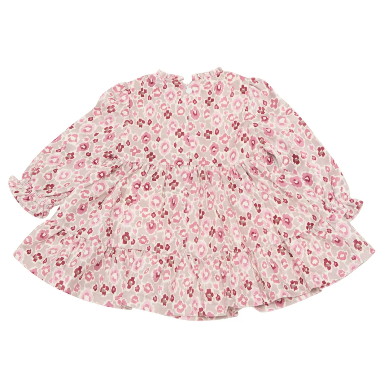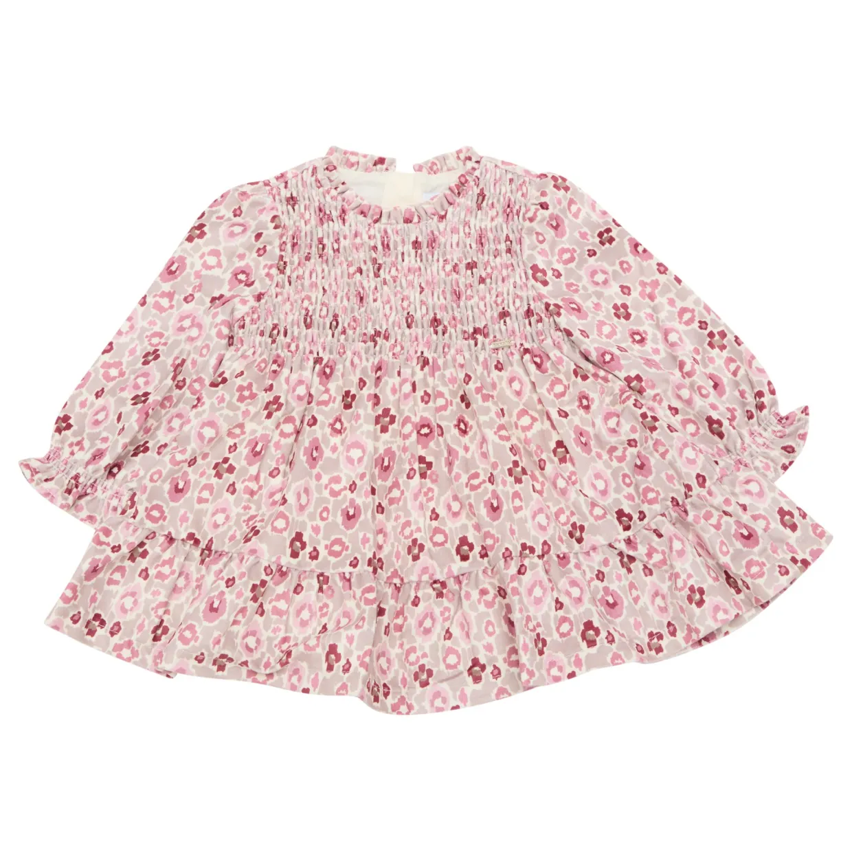 - Frilled cuffs, long sleeves, floral print, ruffled skirt, smocked bodice