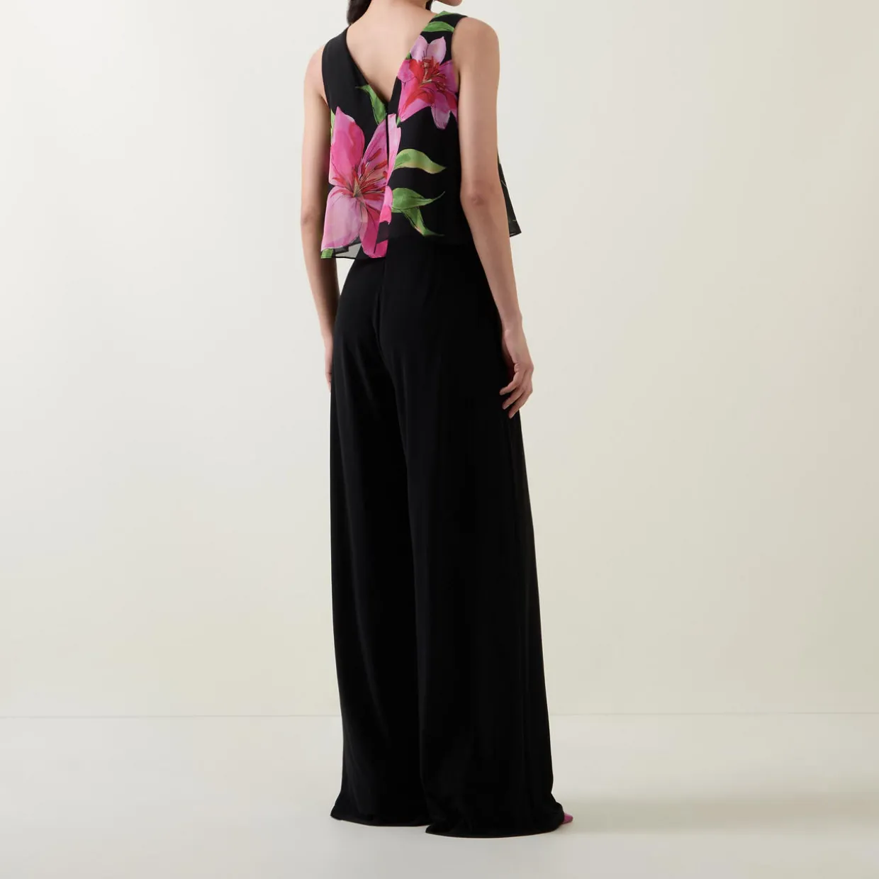 - Round neckline, sleeveless, V-shaped back, wide leg, full length, placement floral print, contrasting design, silky-knit finish