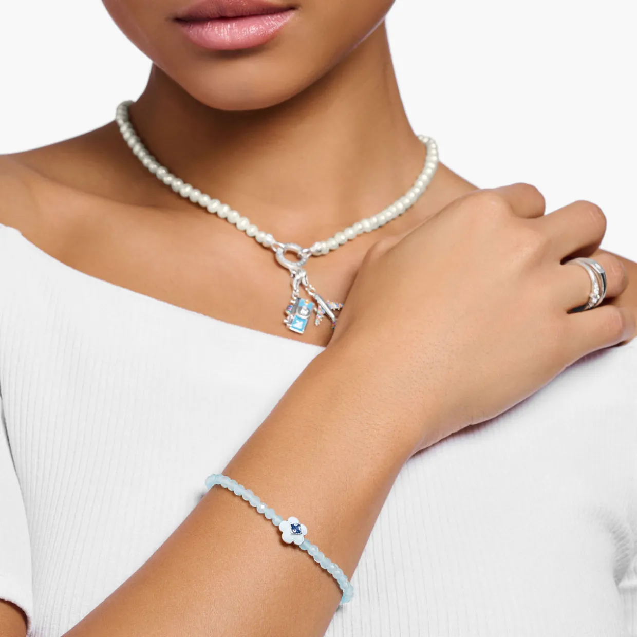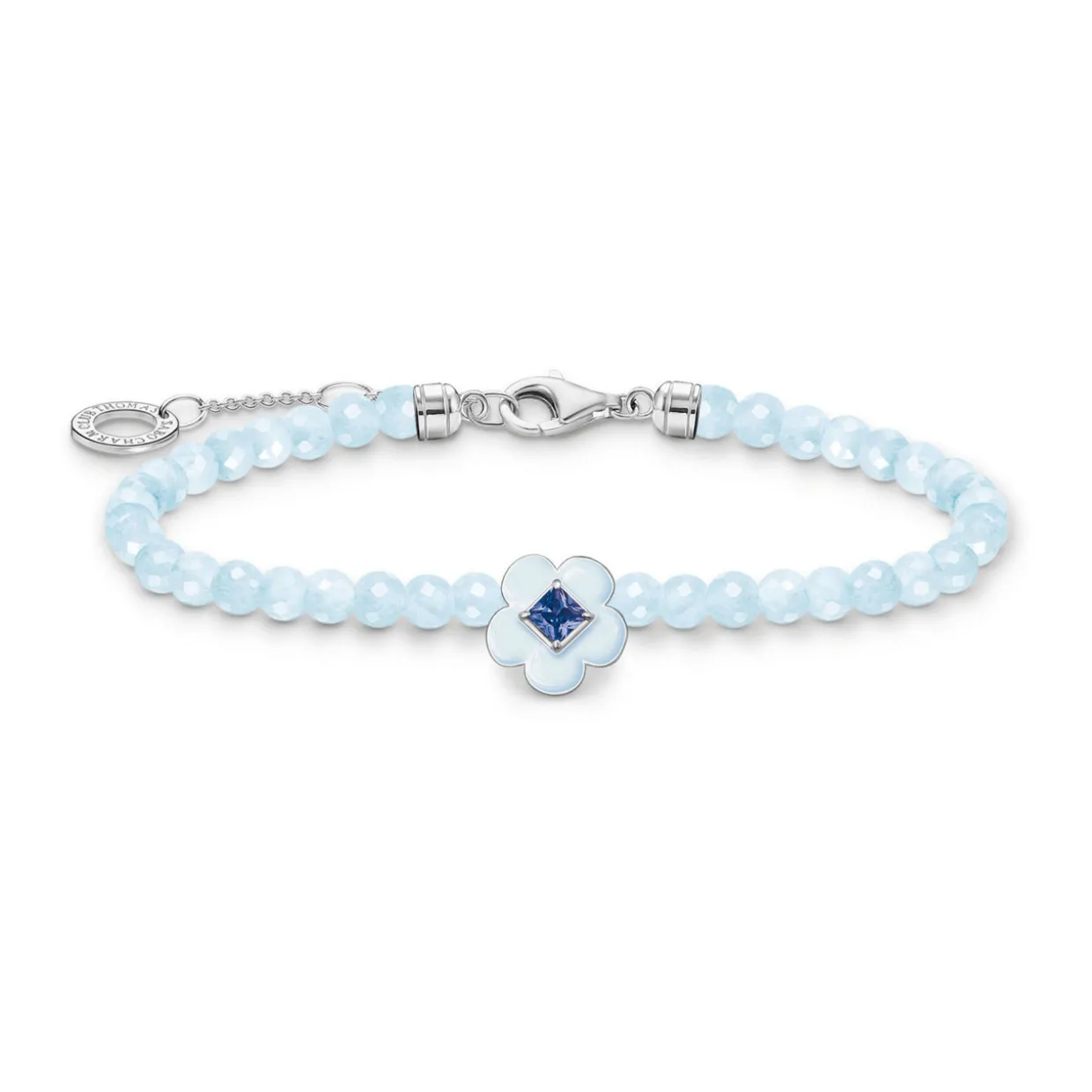 - Beaded, flower detail with stone embellishment, lobster clasp fastening, adjustable fit, ring detail with engraved logo