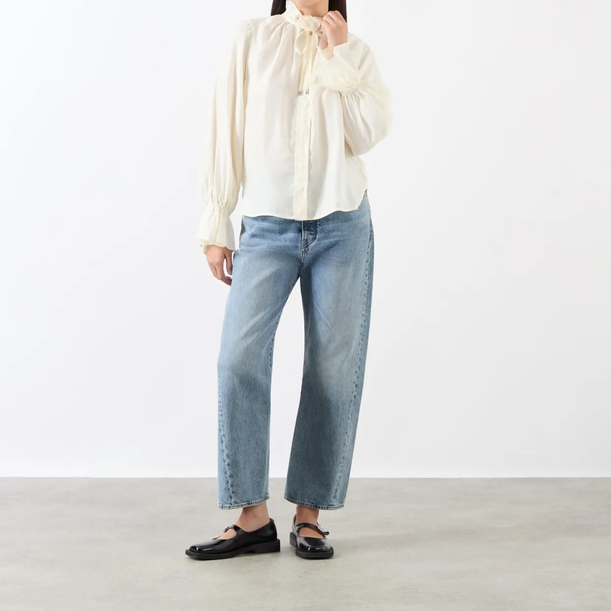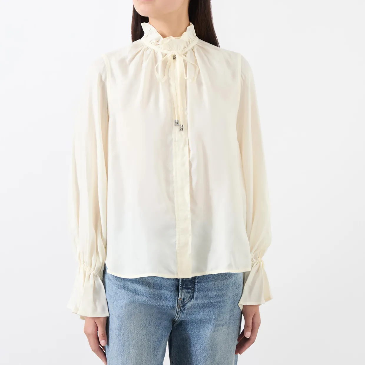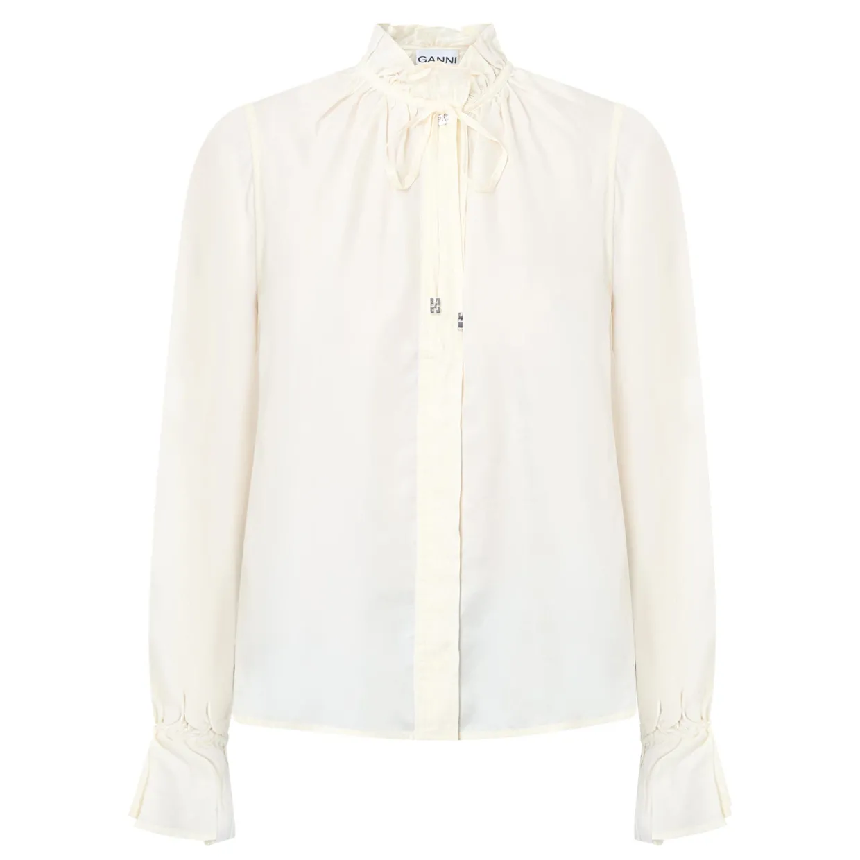 - High neckline, self-tying neckline, ruffled cuff, logo detail, straight hemline