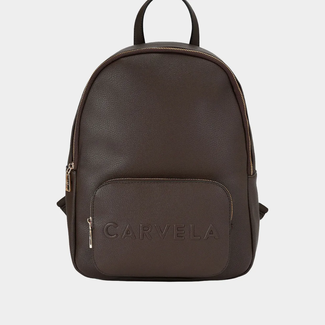 - Backpack silhouette, textured exterior, front zipped pocket, embossed branding, adjustable straps