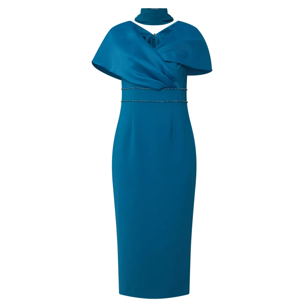 - V-neckline, short sleeves, neck tie, twisted design, gathered bust, embellished detailing around the waist, rear zip fastening, straight hem, midi length, smooth finish