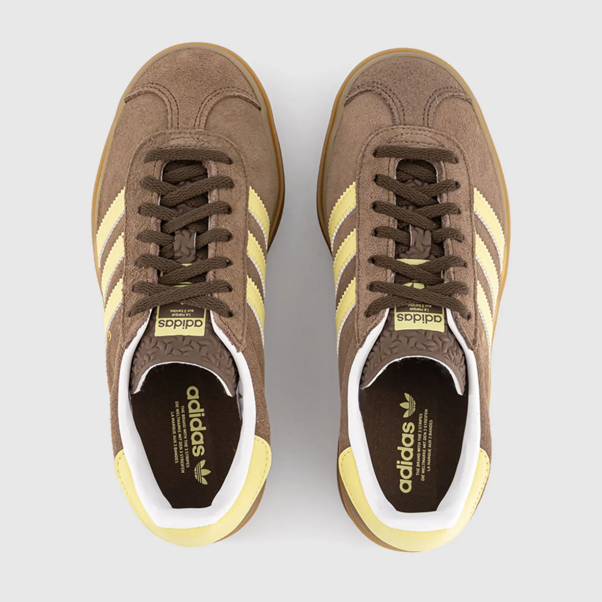 - Platform style, stacked gum sole, suede upper, leather features, textile lining, lace-up fastening, tripe-stripe branding