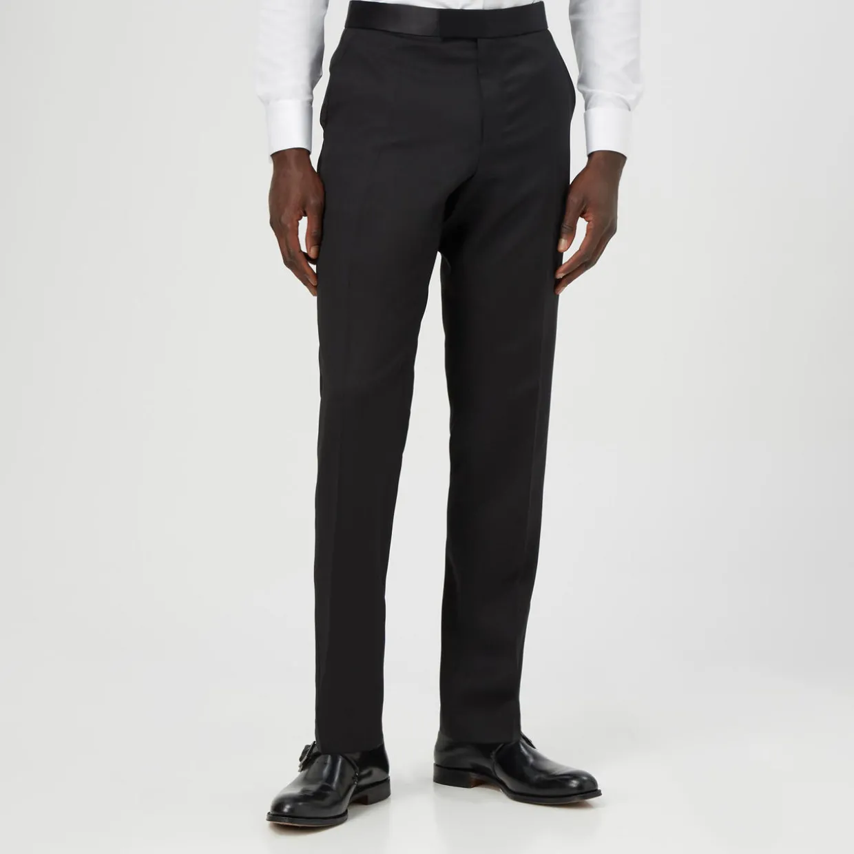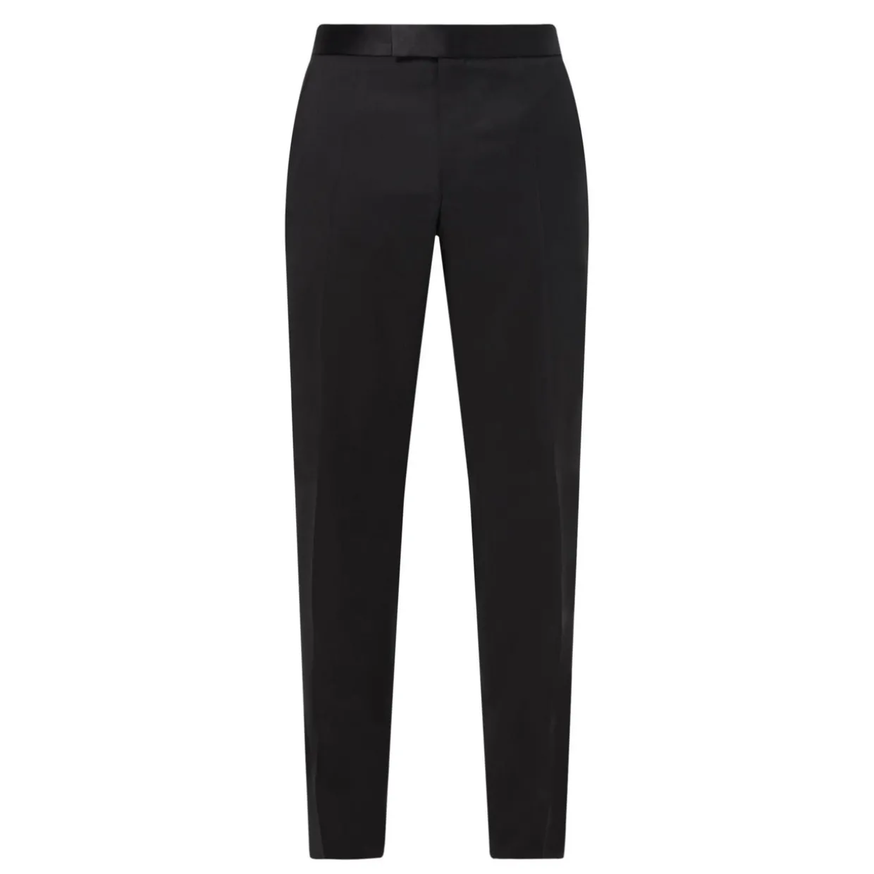 - Four pockets, silk waistband, pressed creases, hook and zip fastening.