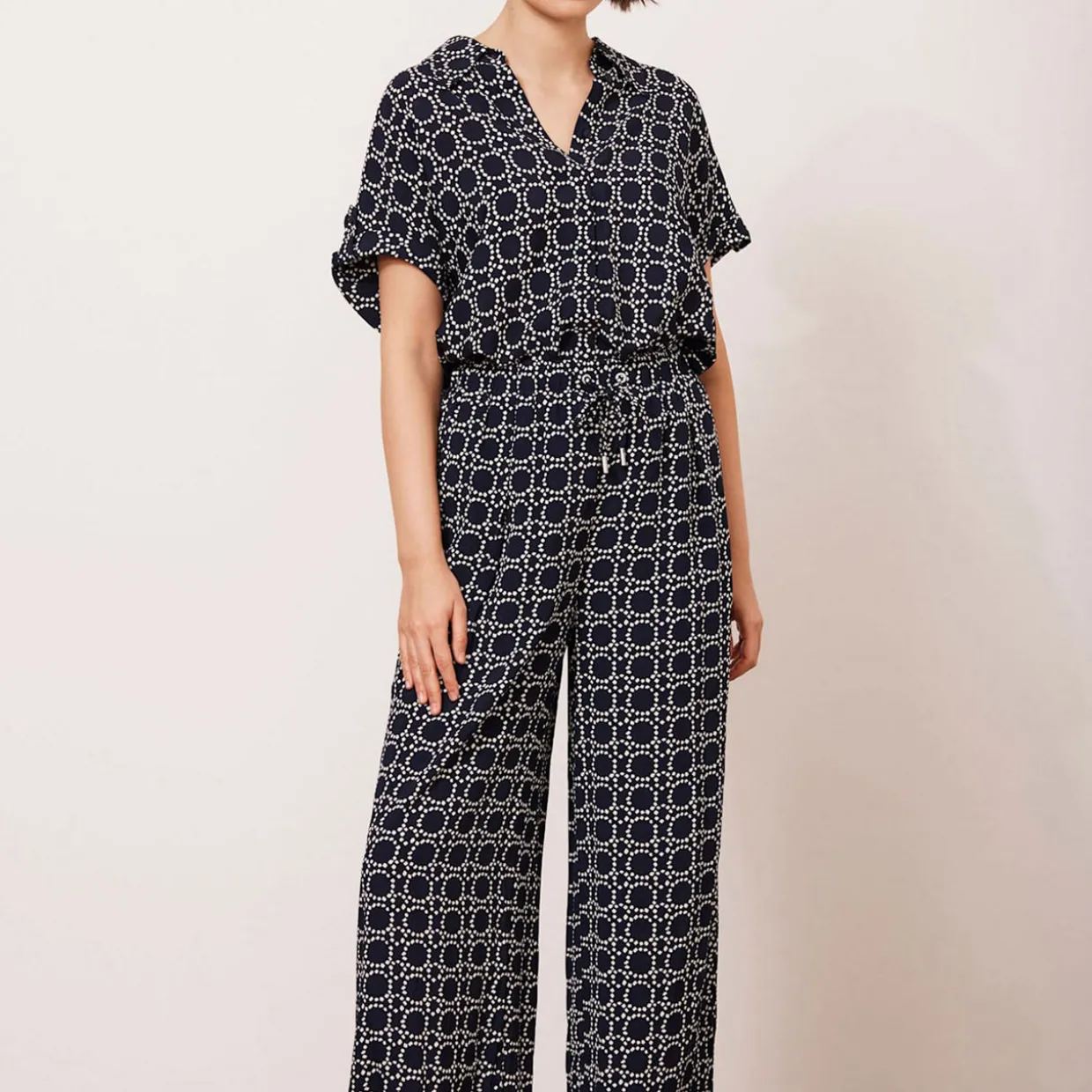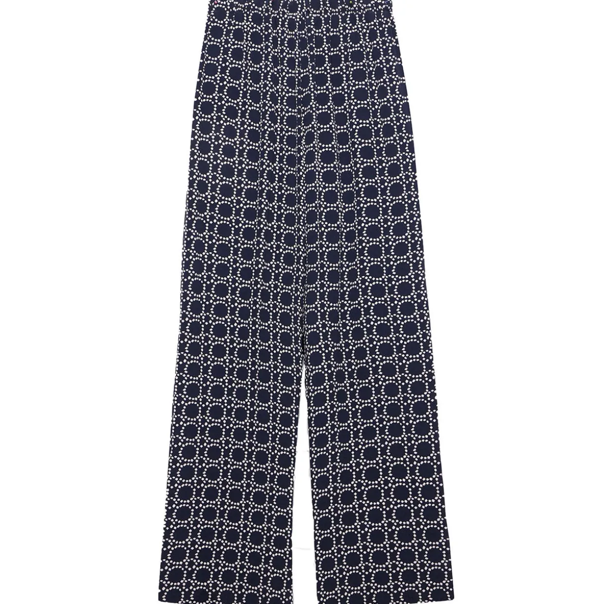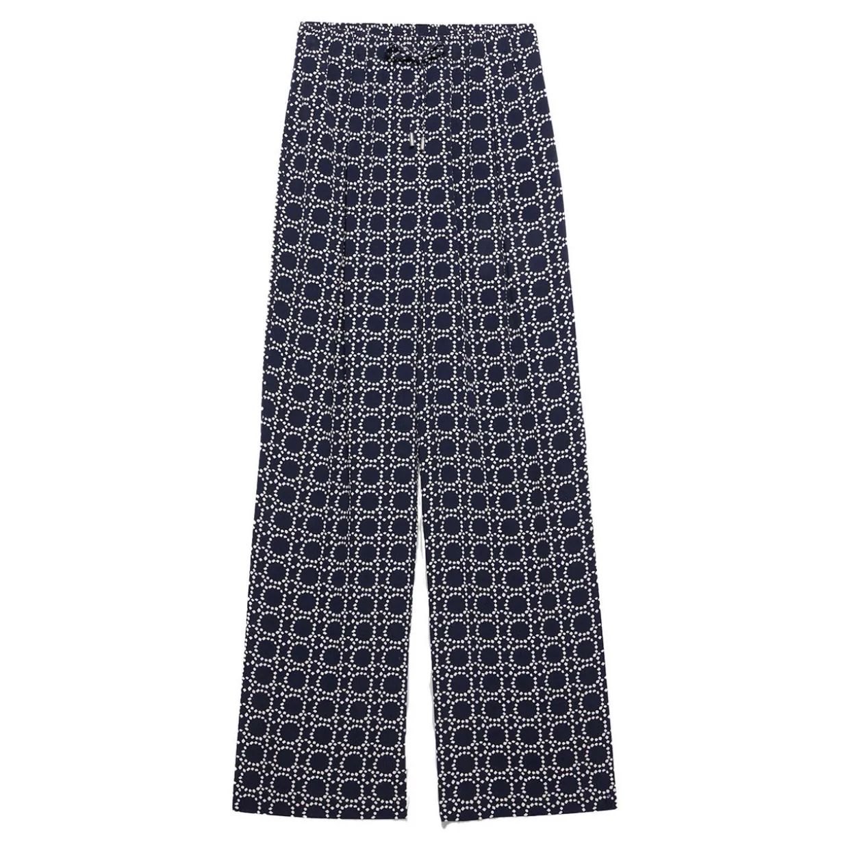 - Geometric print, high rise, elasticated waistband, wide cut leg, drawstring fastening