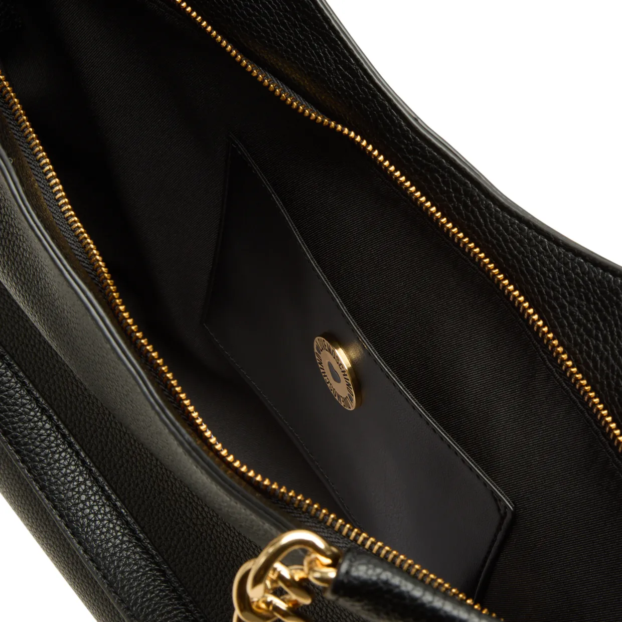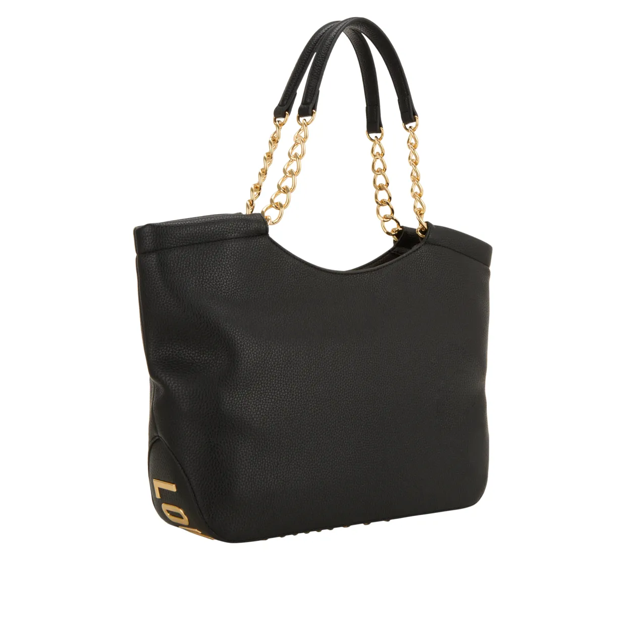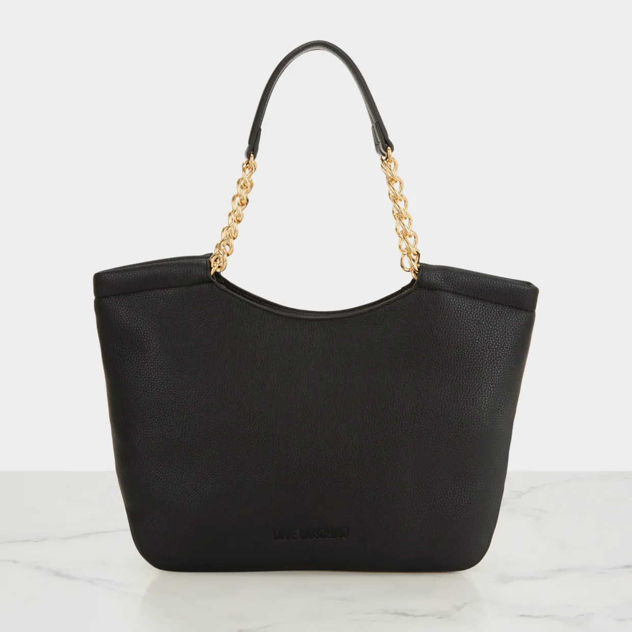 - Chain carry handles, shoulder guards, top zip fastening, structured silhouette, logo lettering at the base, textured design, gold-tone finishes