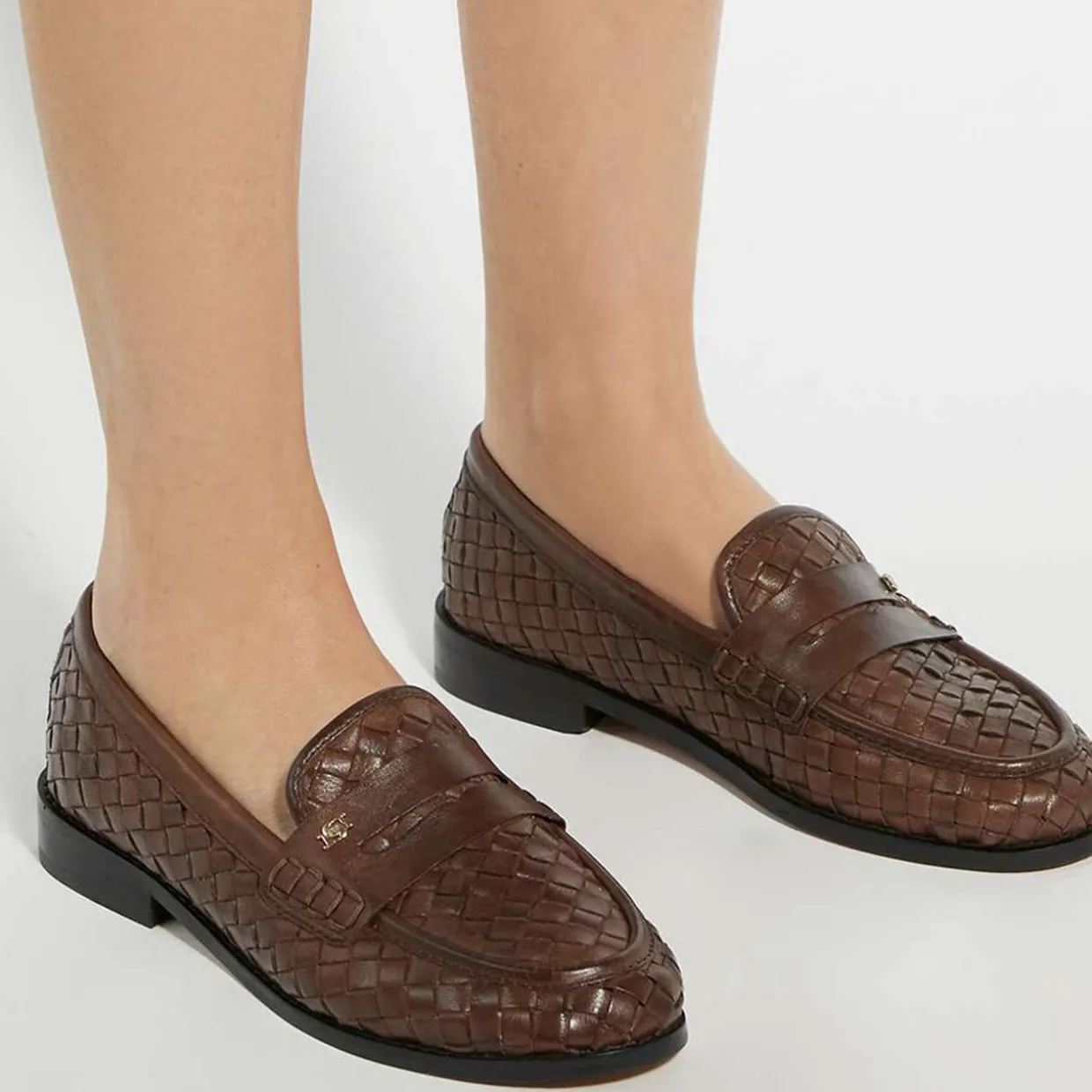 - Round toe, woven structure, low stacked heel, DD logo pin