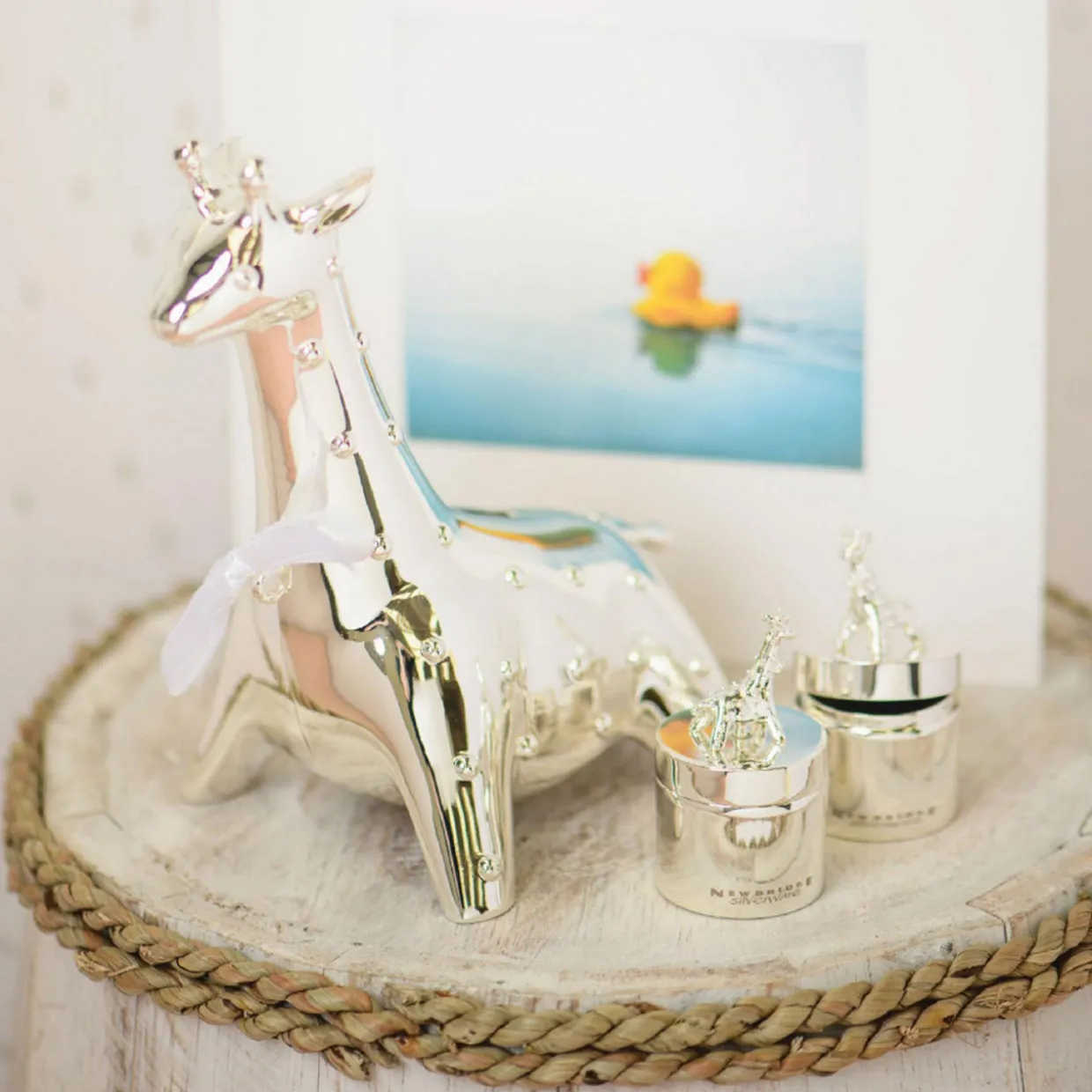 - Giraffe shape, bow detailing, silver-plated, protective anti-tarnish layer