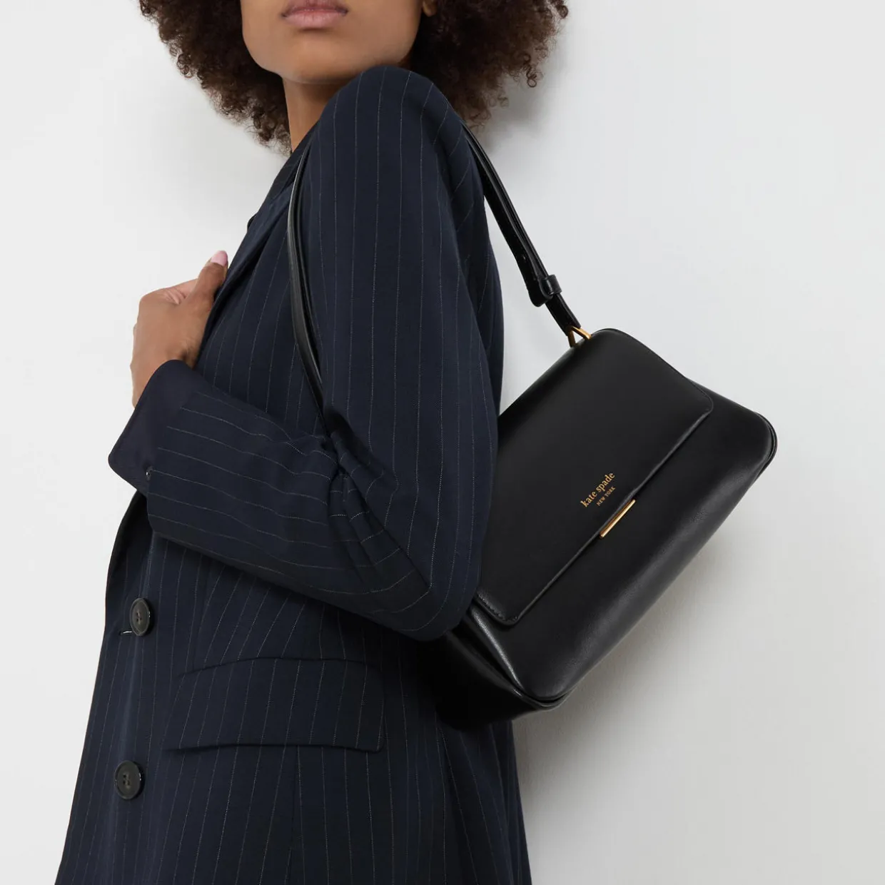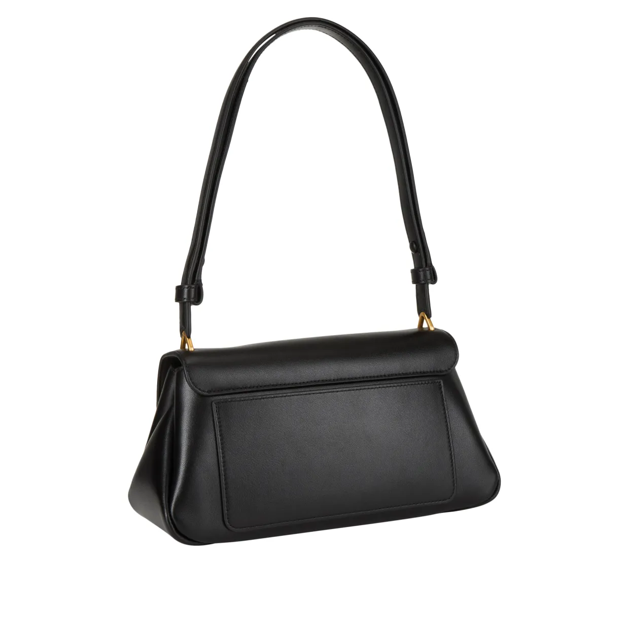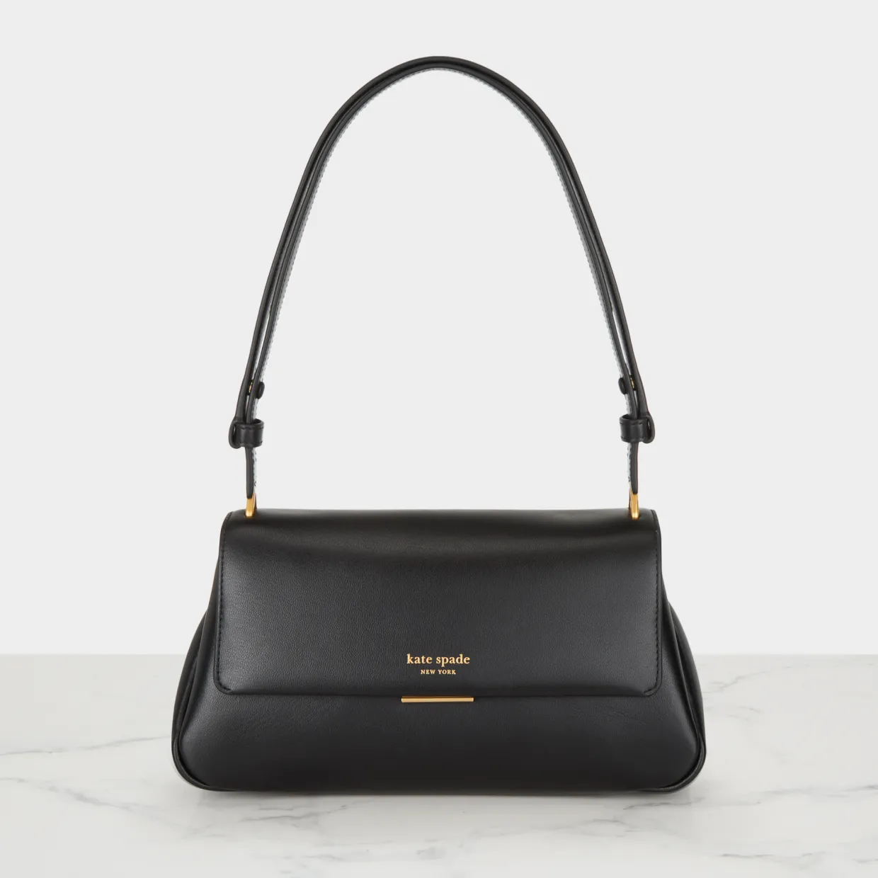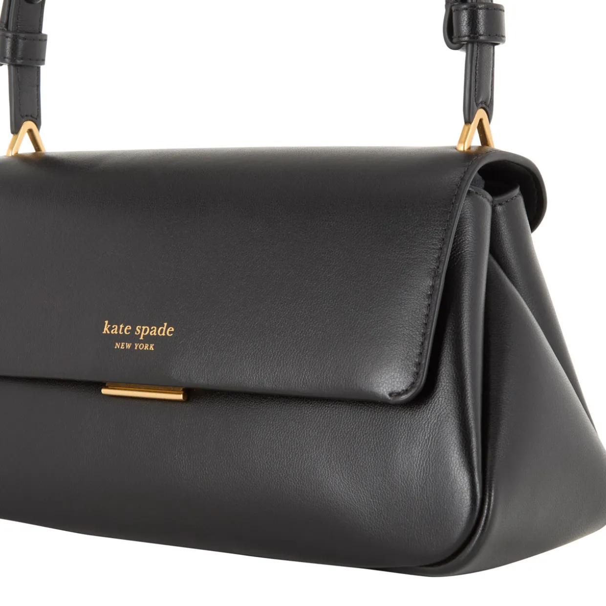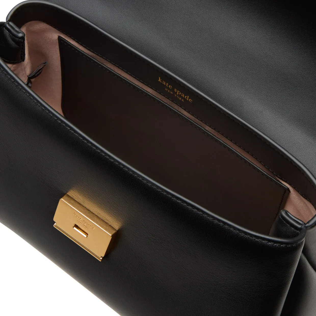 - Flap closure with push lock fastening, gold-tone hardware, adjustable shoulder strap, can be worn as a crossbody bag, one exterior slip pocket, foil embossed logo detail, smooth leather finish