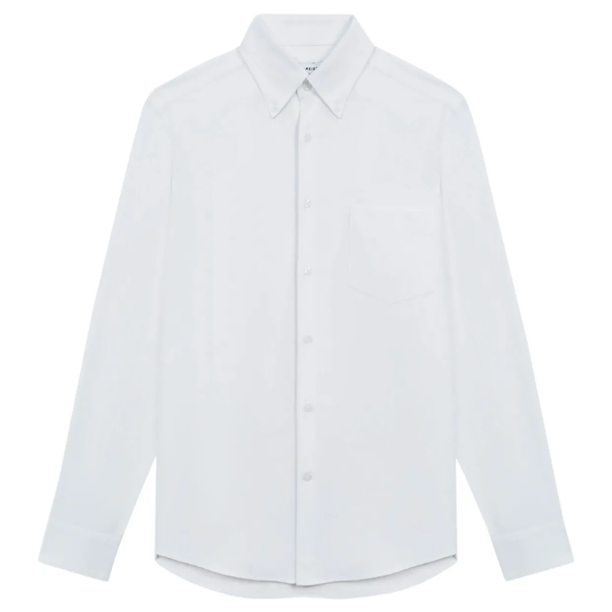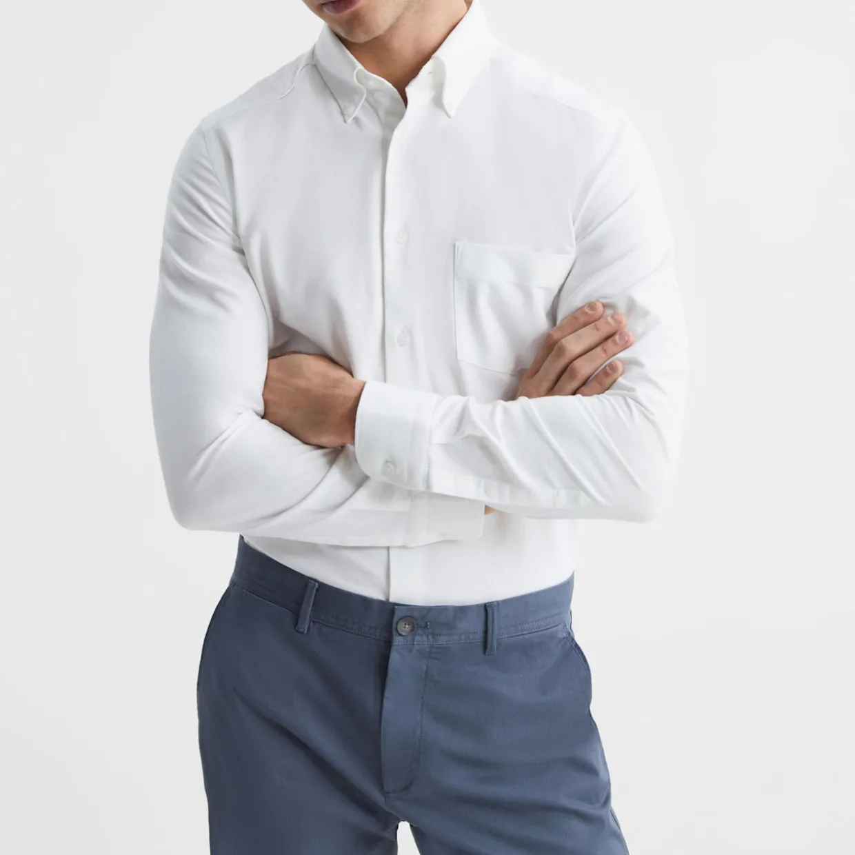 - Two-ply cotton, Oxford style, soft-wash finish, button-down collar, patch pocket to left chest plate, long sleeves, buttoned cuffs, slim fit