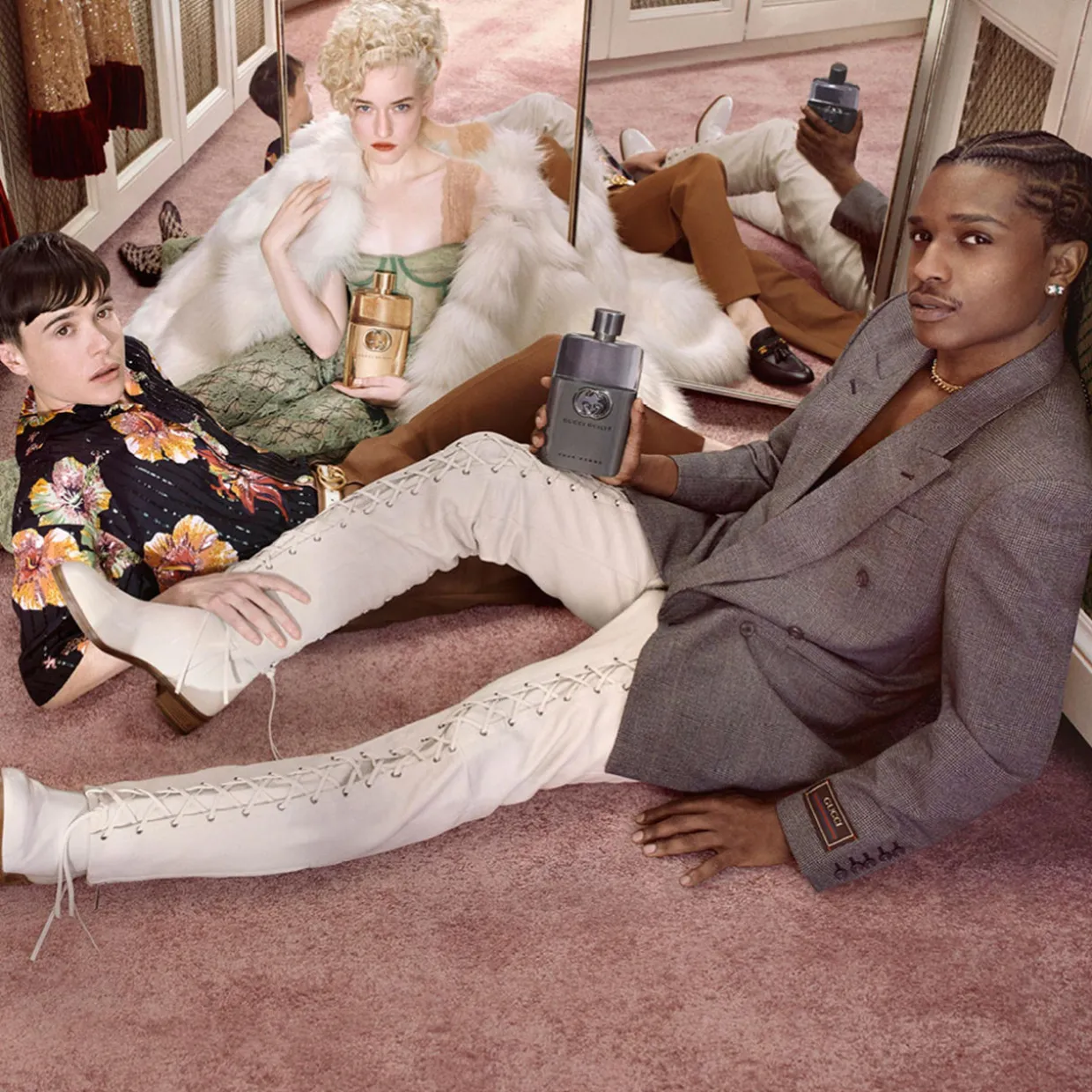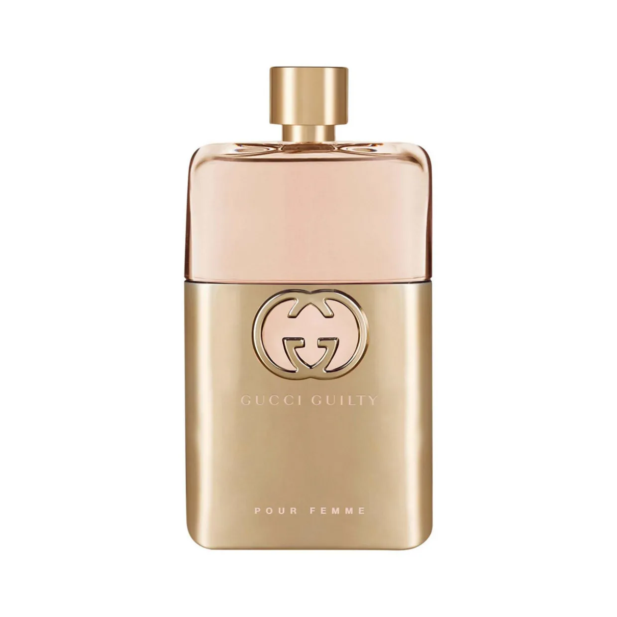 - The Bottle Echoing the same shape as the counterpart men’s fragrance, the Gucci Guilty For Her bottle is partly wrapped in gold-toned metal, with a matching shimmering cap, reflecting the pale rose-tinted fragrance inside. The Interlocking G logo defines the front.