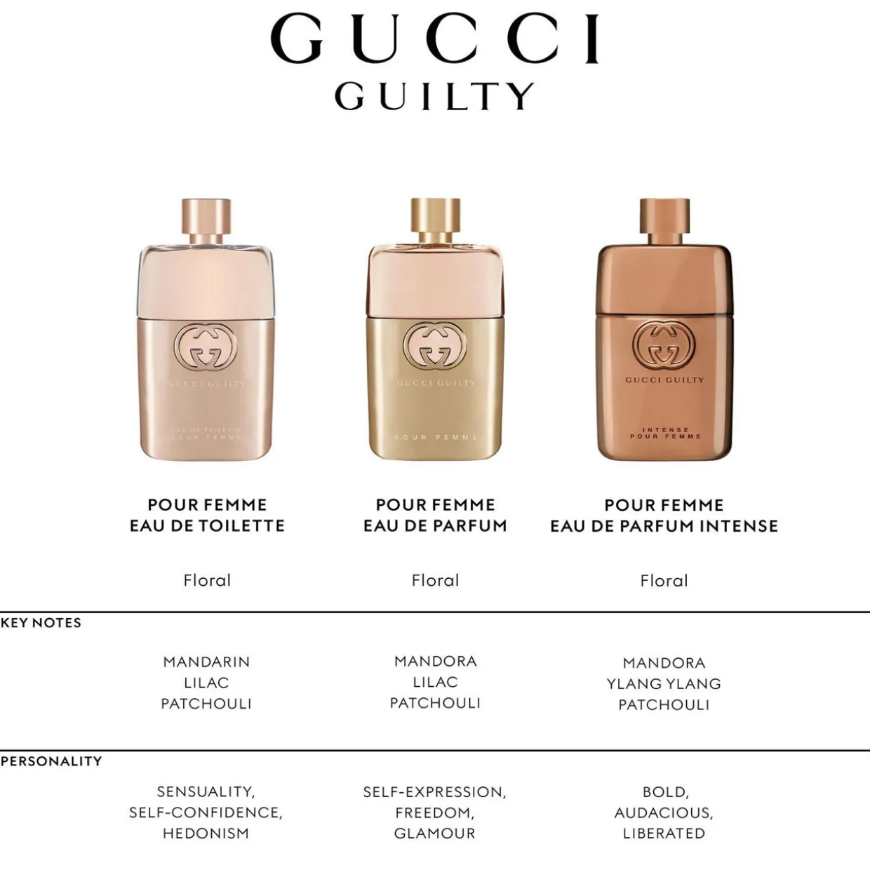 A distinctive ambery floral accord, Gucci Guilty For Her Eau de Parfum is defined by the light, fresh femininity of lilac petals with a sparkling citrus Mandora twist on a trail of rich and sensual amber notes and Patchouli.
