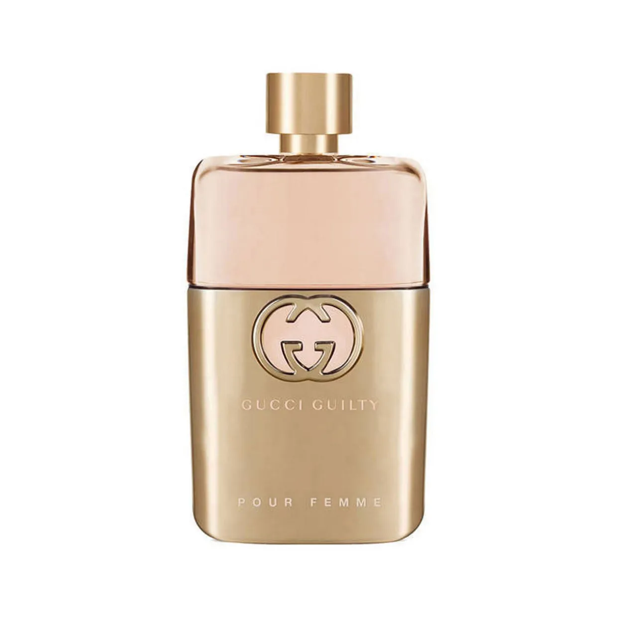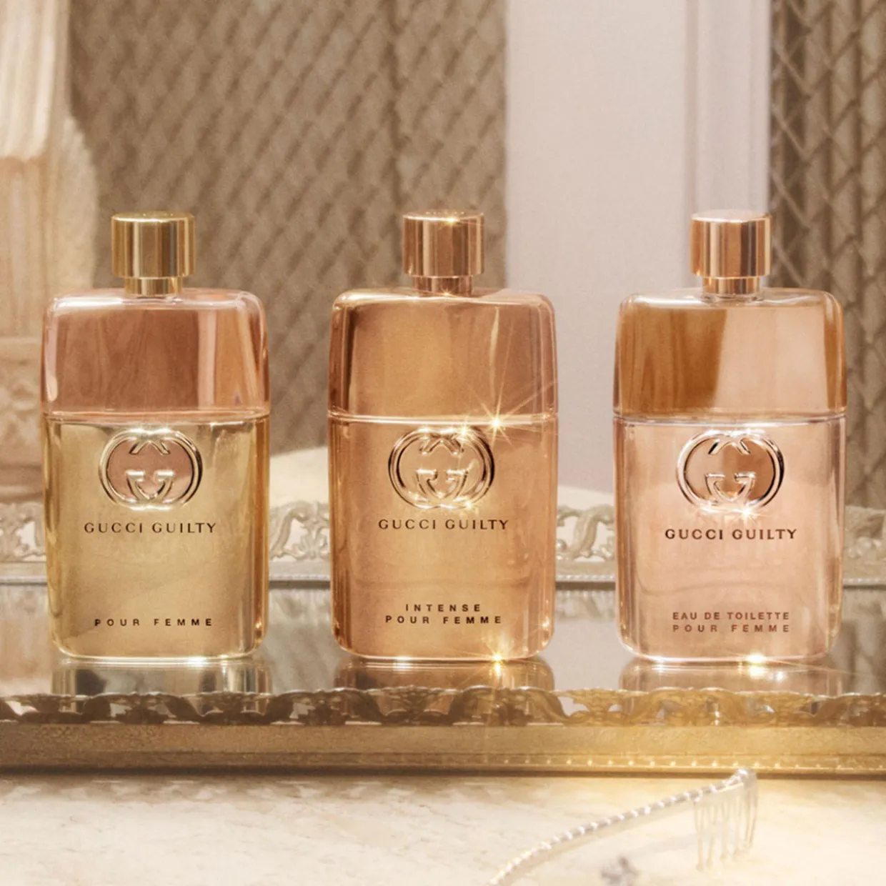 - The Bottle Echoing the same shape as the counterpart men’s fragrance, the Gucci Guilty For Her bottle is partly wrapped in gold-toned metal, with a matching shimmering cap, reflecting the pale rose-tinted fragrance inside. The Interlocking G logo defines the front.