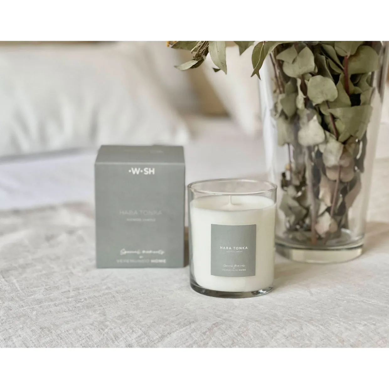 - 91% vegetable wax and 9% perfume, features a clear glass container with a wooden lid, and a cotton wick. Habatonka fragrance with a floral and woody aroma