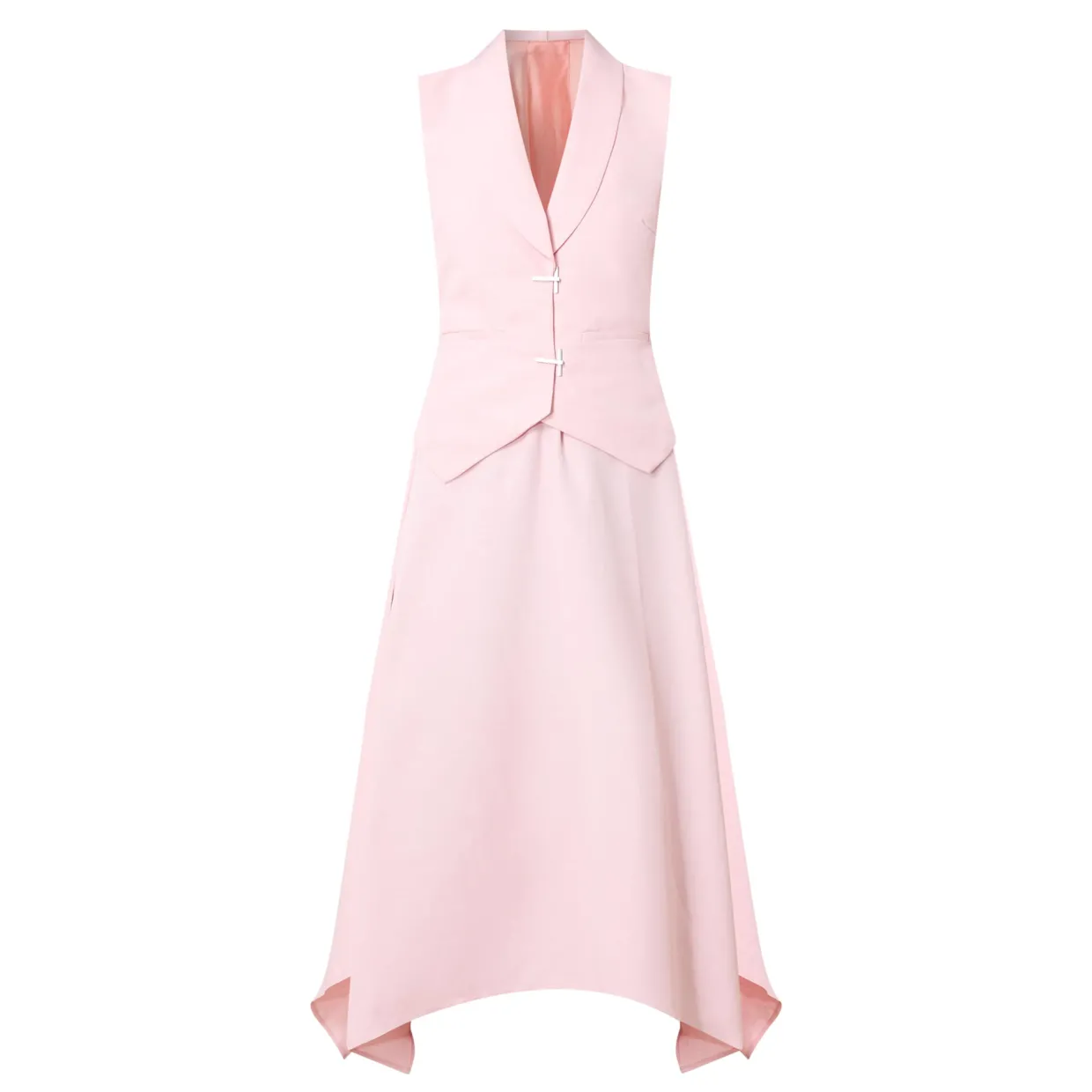 - V-neckline, tuxedo lapel, sleeveless, midi length, handkerchief hemline, jet pockets, adjustable tie detail to the back, T-bar clasps to the front
