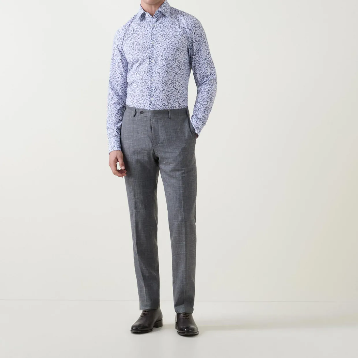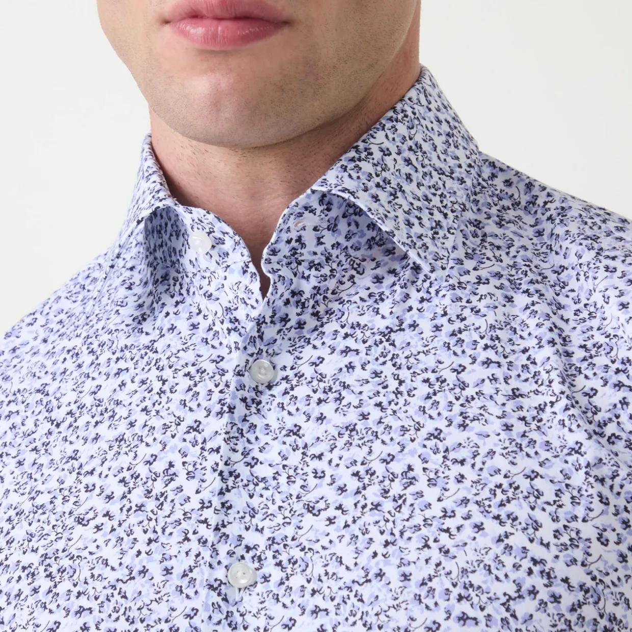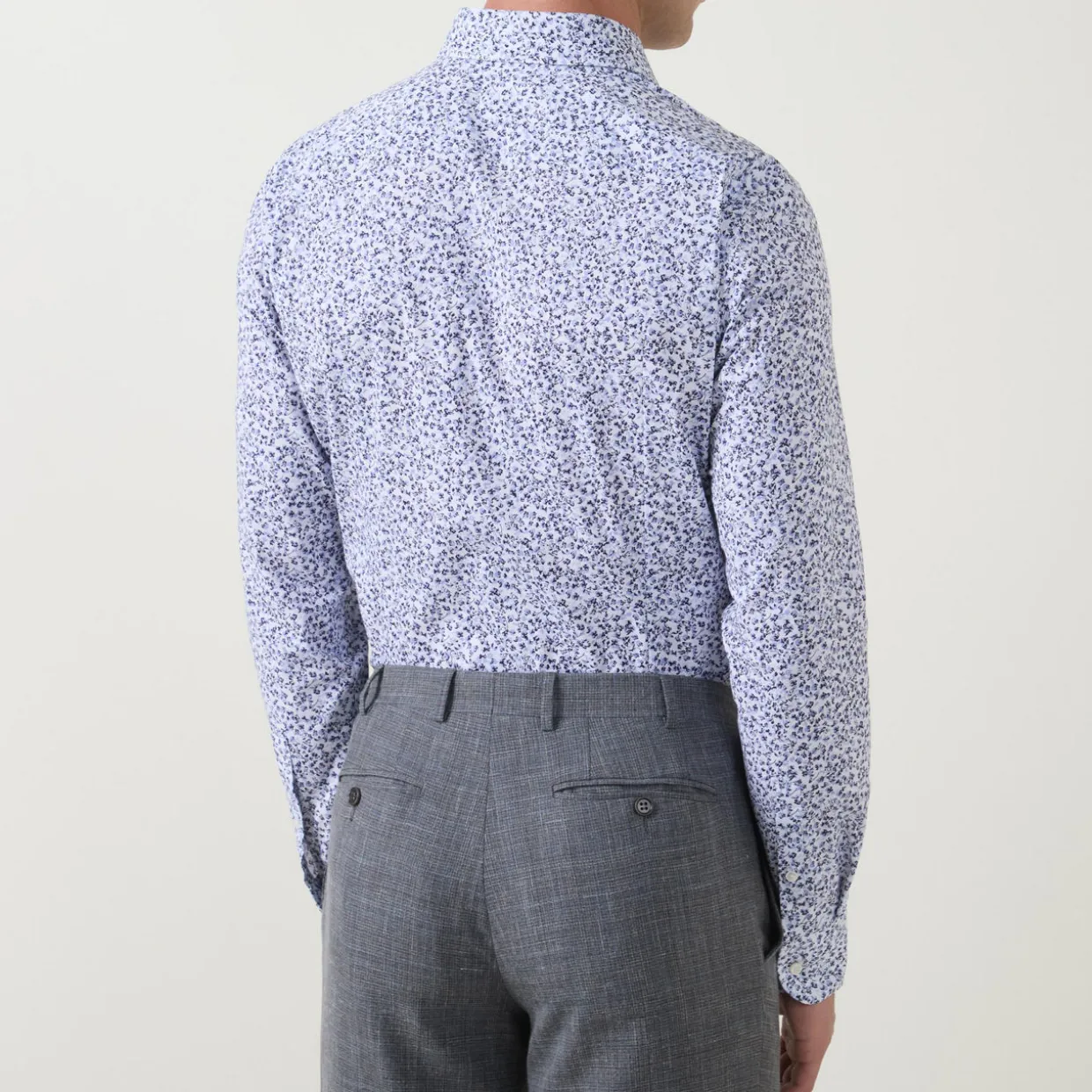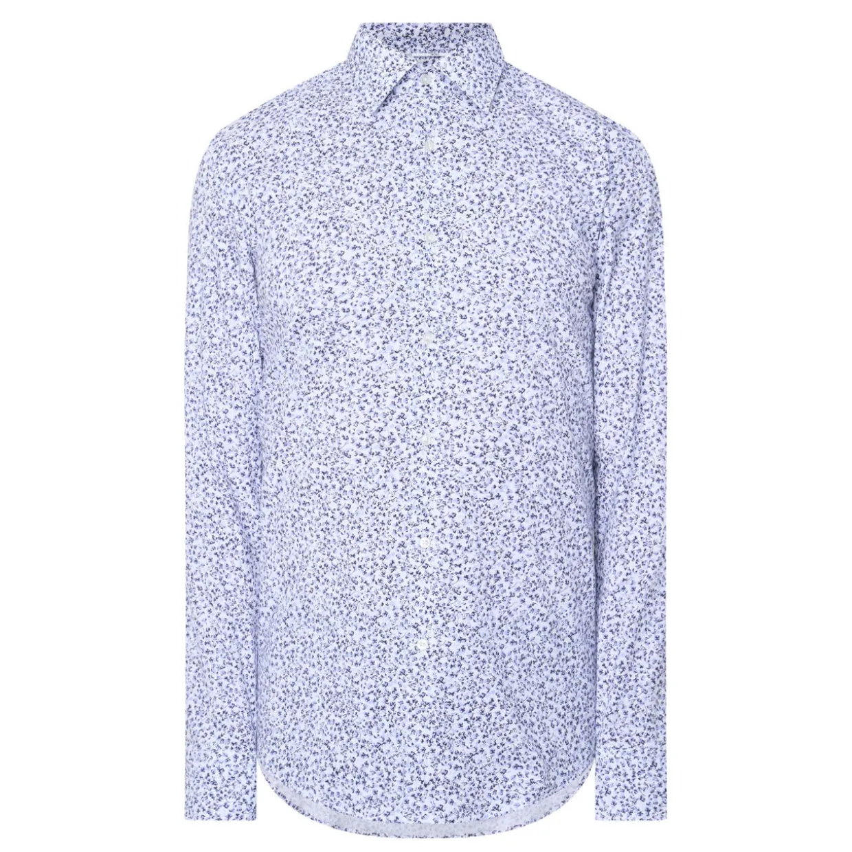 - Single cuffs, long sleeves, pointed collar, button fastenings, curved hemline, easy to iron, floral print