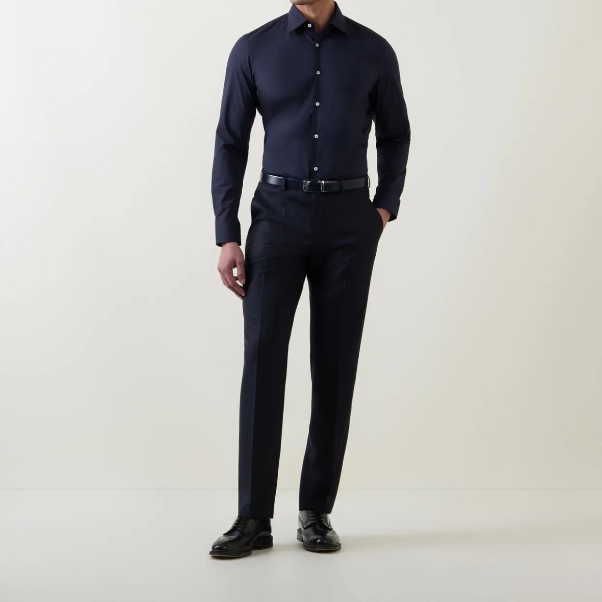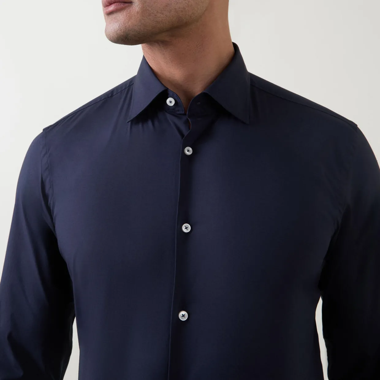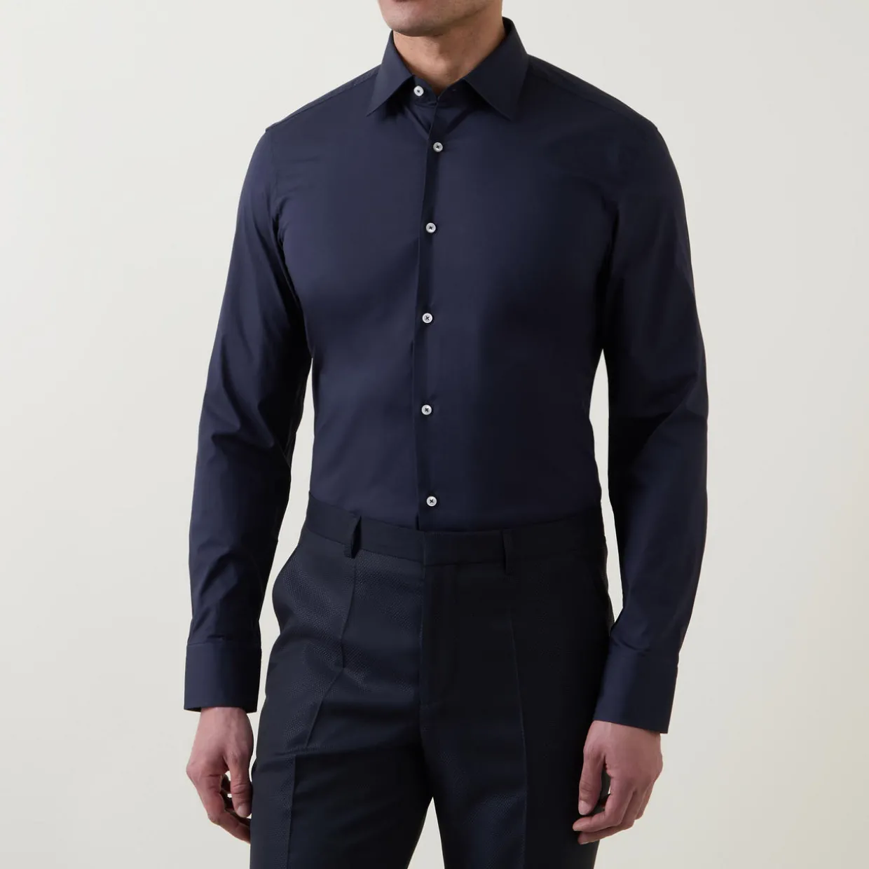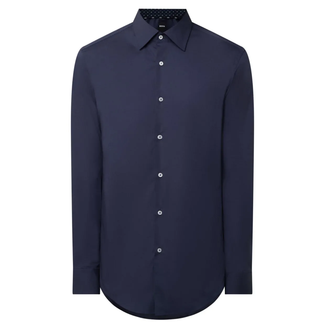 - Cut-away collar, curved hemline, long sleeves, single cuff, easy iron