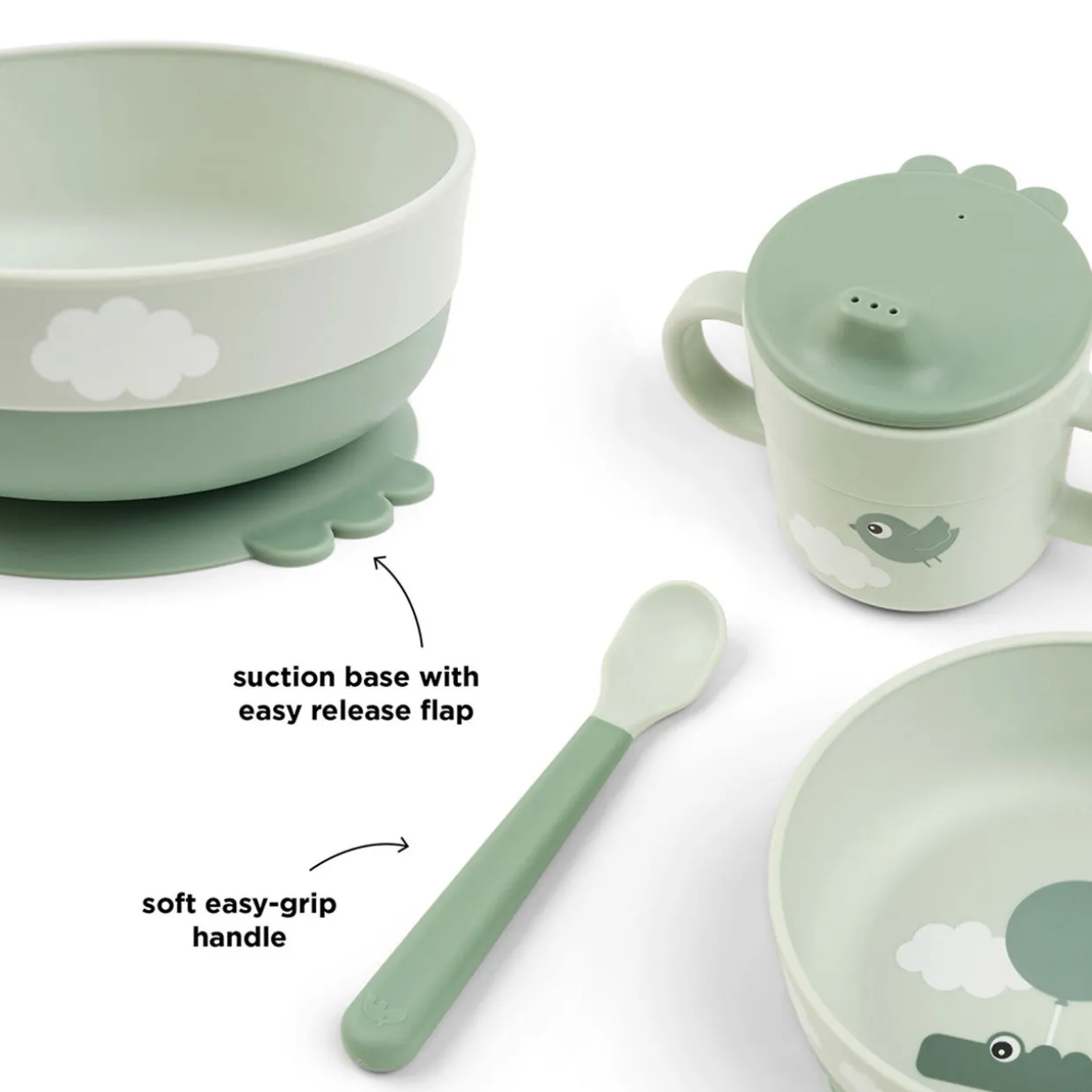 - Set of three includes one bowl with suction base, easy-grip spoon and a two-handle spout cup, animal character print