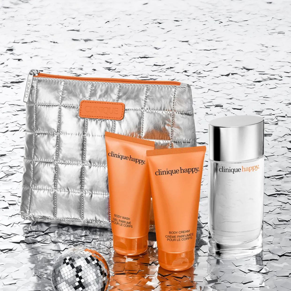 Description: This 4-piece fragrance and body care gift set features a trio of Clinique’s Happy™ fragranced products.