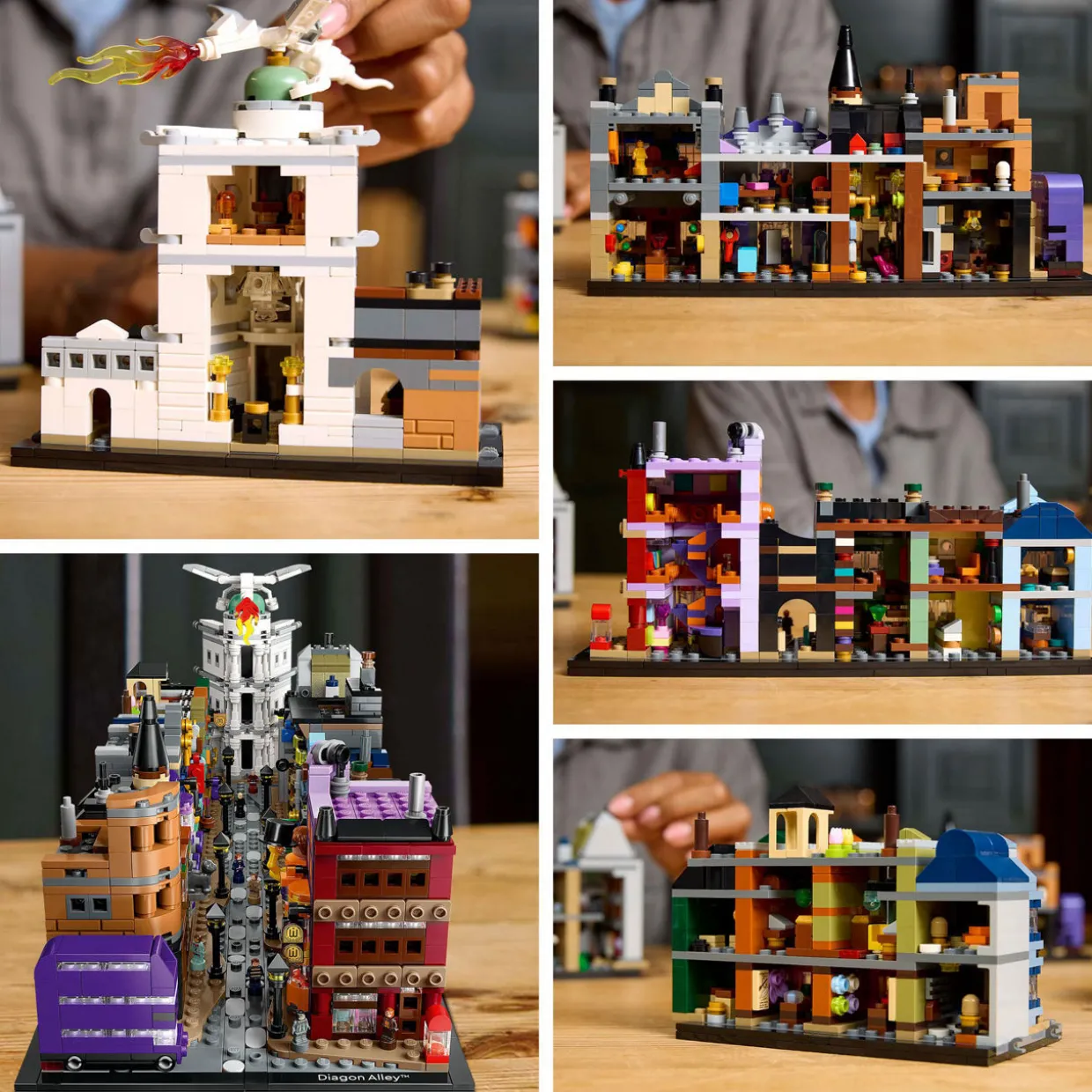 - 2,750 pieces, micromodel of Diagon Alley with authentic details of its wizarding shops, 12 LEGO® Harry Potter™ microfigures including Harry Potter, Ron Weasley™, Hermione Granger™, Fred Weasley, George Weasley, Lavender Brown, Ginny Weasley™, Draco Malfoy™, Narcissa Malfoy, Mr. Borgin and more